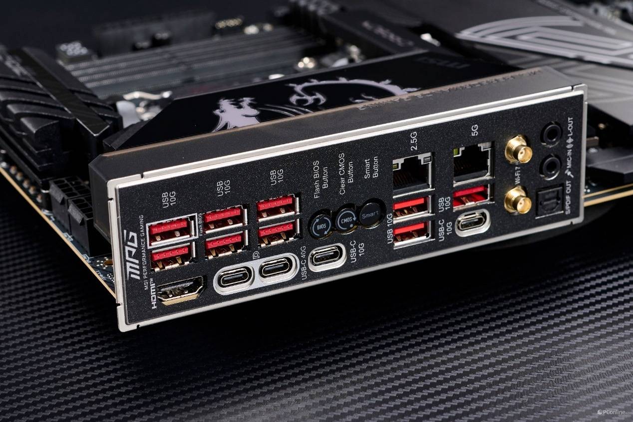 最后当然是IO接口部分了,微星给这款主板塞得满满当当的。提供的9个USB-A接口全部都是10Gbps速率,这一点值得夸赞!4个Type-C接口也进行了升级,最顶级的要属其中2个40Gbps的USB4接口了,不仅传输速率拉满,还能用于视频显示输出。剩下的两个Type-C也给到了10Gbps的USB 3.2 Gen 2。剩下还有1个HDMI 2.1视频输出口,2个RJ45网口(5Gbps+2.5Gbps)、WiFi 7天线接口以及音频接口。