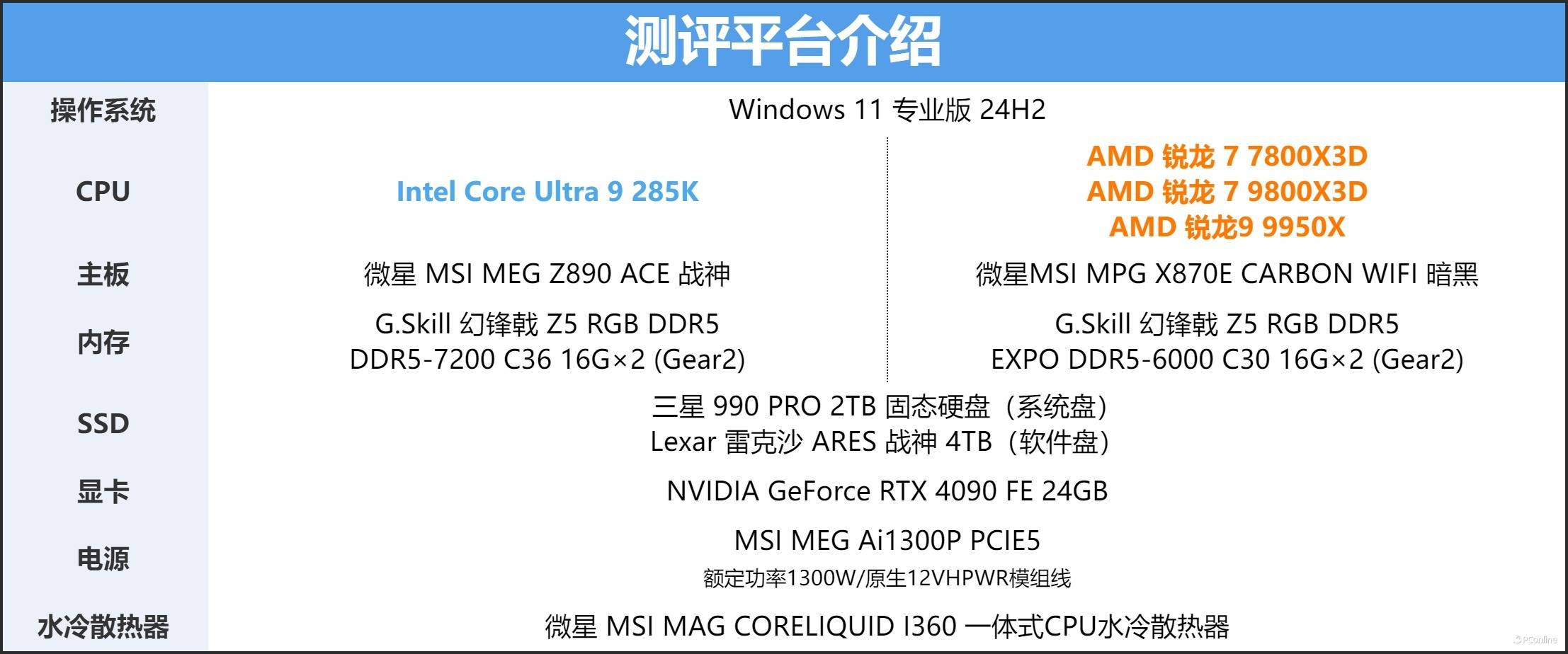 来到测试平台介绍部分,下面的测试里我们准备了前代同样具备3D V-Cache的锐龙7800X3D以及最新的锐龙9950X,还有对手最新推出的酷睿Ultra 9 285K进行对比,来看看最新的锐龙9800X3D能否再续X3D游戏神U的荣光,一举称霸游戏领域。