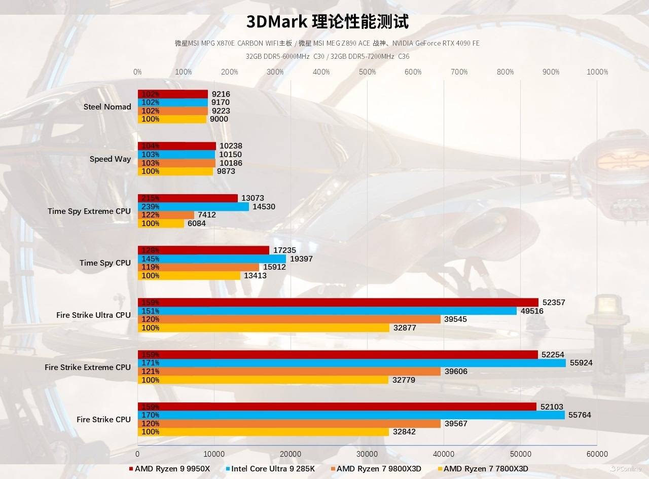 而酷睿Ultra 9 285K以及锐龙9950X则是以更豪华的规格继续领跑,其中锐龙9950X的表现比对手高了快50%左右,相当强势。
