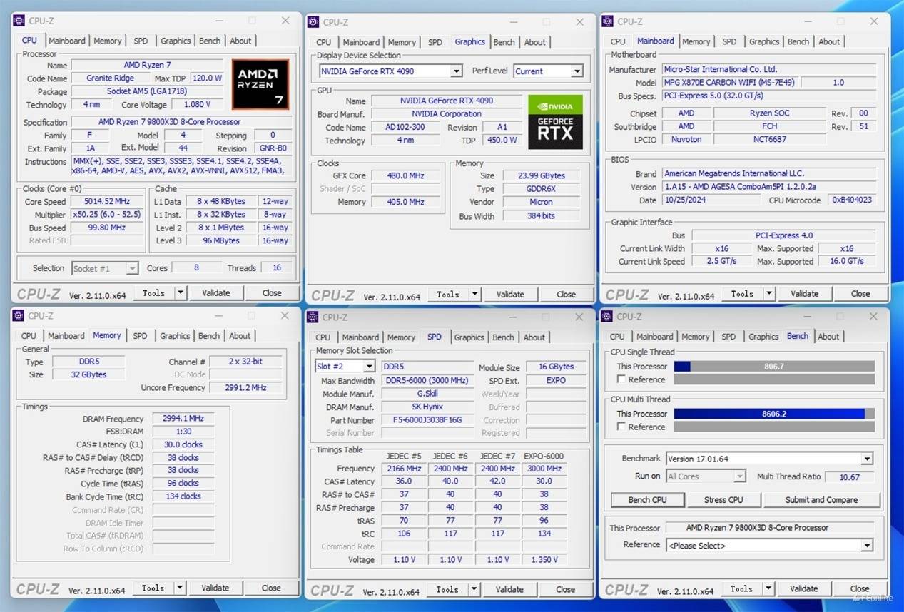 测试时我们则是选用了芝奇G.SKILL幻锋戟DDR5-6000 16GB×2套条,并且将时序压至C30,超低的时序加上微星DDR5黑科技,助力锐龙9800X3D强势输出。