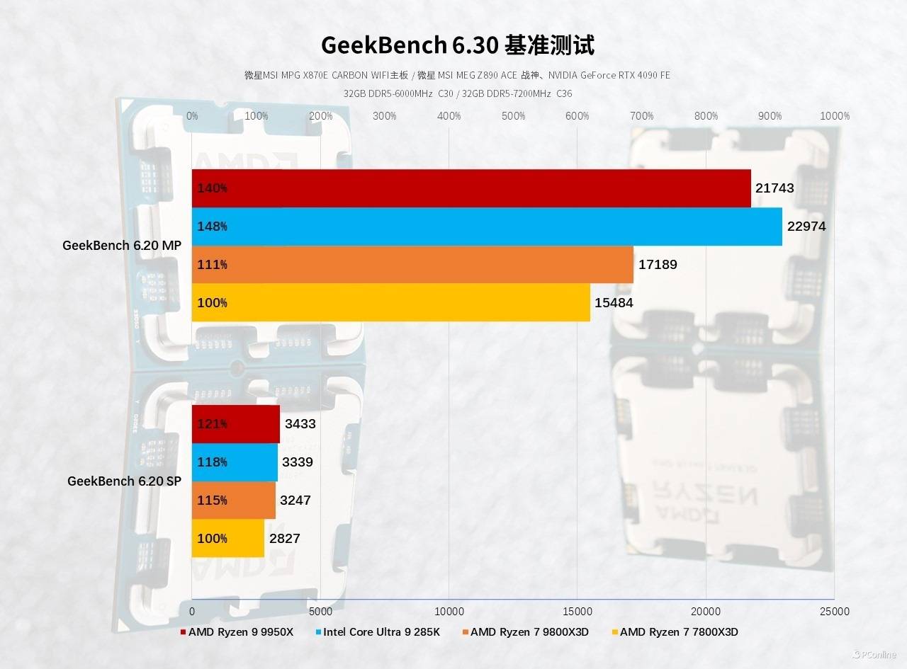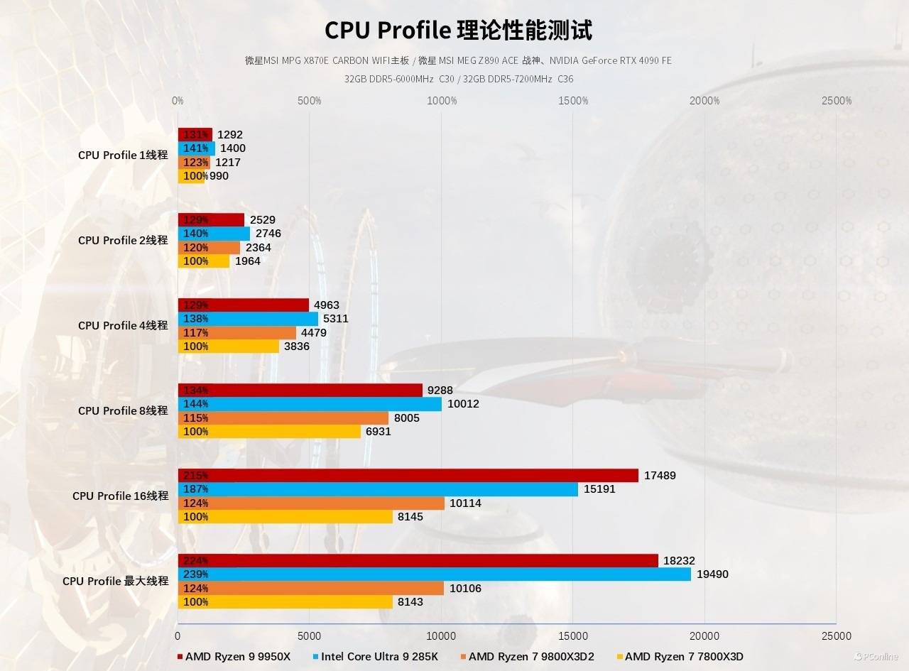 至于酷睿Ultra 9 285K,24核心24线程还是有着不可比拟的优势,无论是单线程还是多线程,依旧是榜首的位置。锐龙9950X则紧追其后,二者在单核性能上的差距不足10%,多核则相差20%左右。