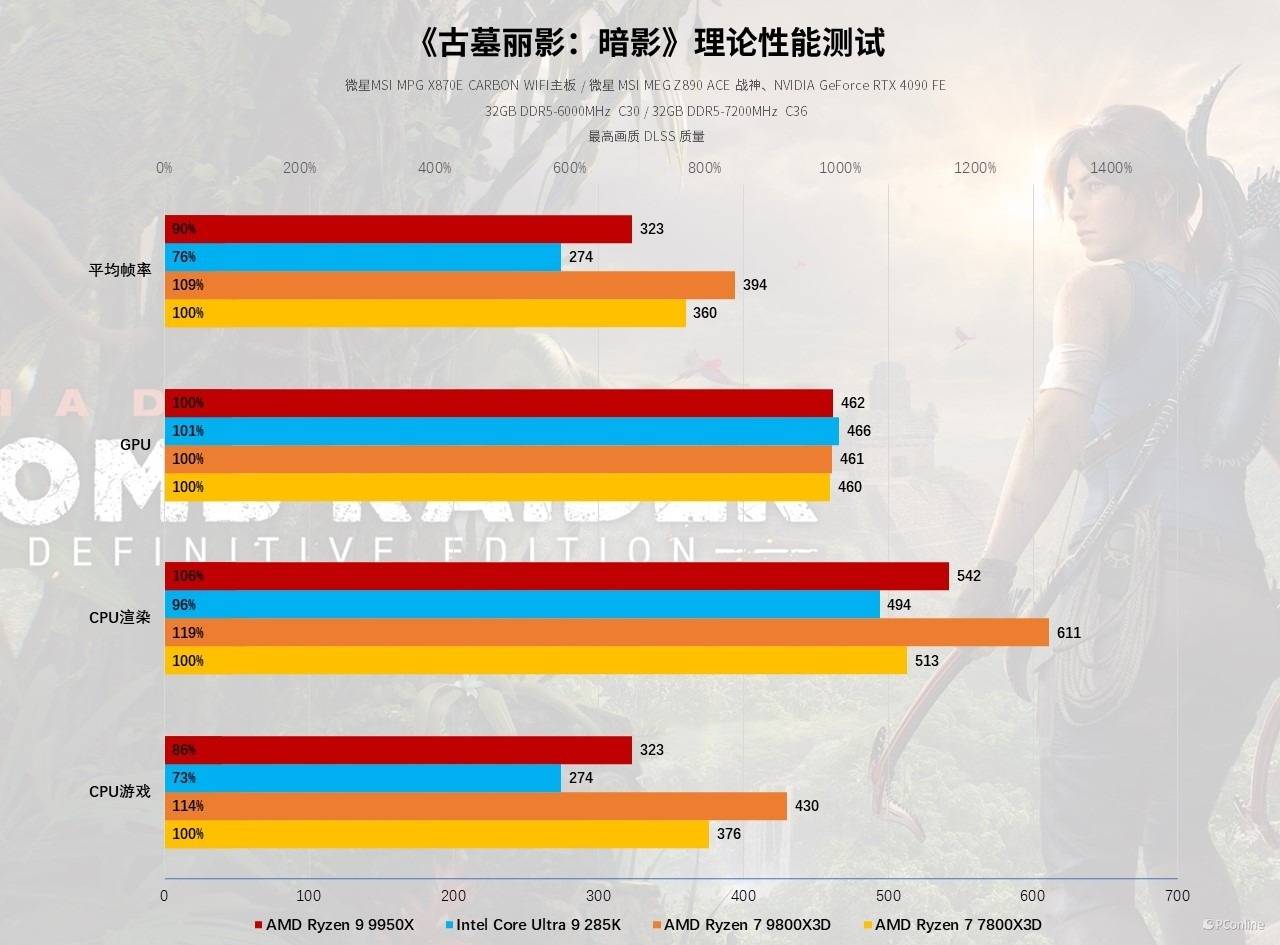 《古墓丽影:暗影》就更离谱了,同样的1080P最高画质,锐龙9800X3D的平均帧直接比酷睿Ultra 9 285K高出100多帧,394 FPS的表现同样也强于自家的老大哥锐龙9950X,对比前代锐龙7800X3D的话,也有9%左右的性能提升。如果看CPU渲染或CPU游戏的话,锐龙9800X3D的提升幅度就更明显一些了,对比同是X3D的处理器,能够提升14-19%。