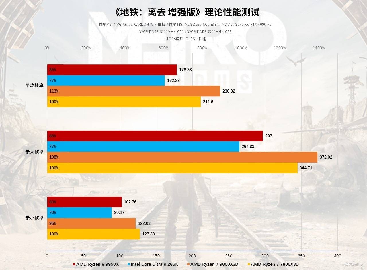 《地铁离去:增强版》的提升也比较明显,平均帧率由原来的238.22 FPS提升至254,84 FPS,涨幅同样在7-8%左右。
