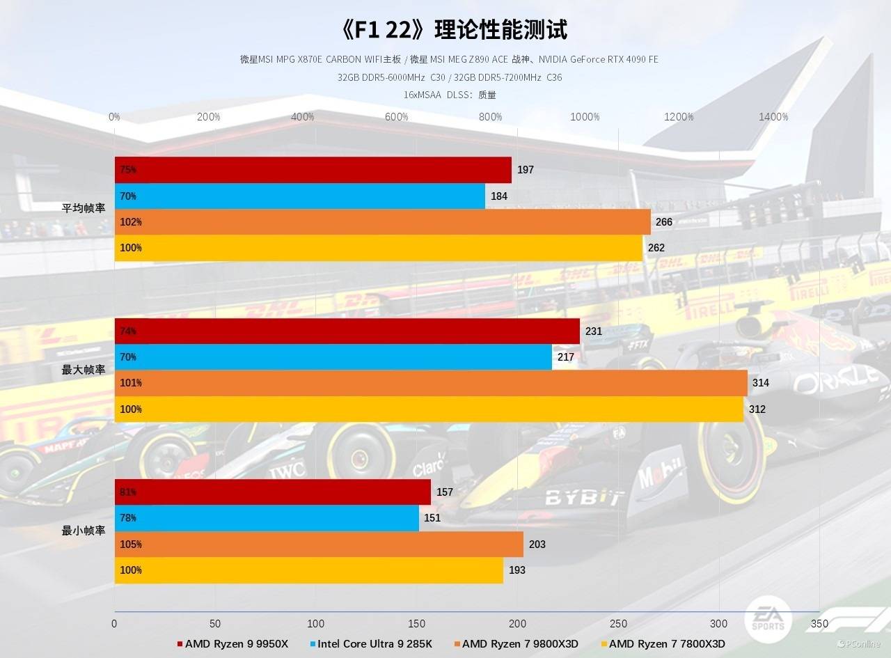 《F1 22》就不像《极限竞速:地平线5》一样了,X3D系列处理器在这里就是真正的遥遥领先,锐龙9800X3D直接以266 FPS平均帧杀死比赛,1%Low帧也来到了203 FPS,二者对比起锐龙9950X也好,还是酷睿Ultra 9 285K,都是30%左右的性能提升,非常强势。