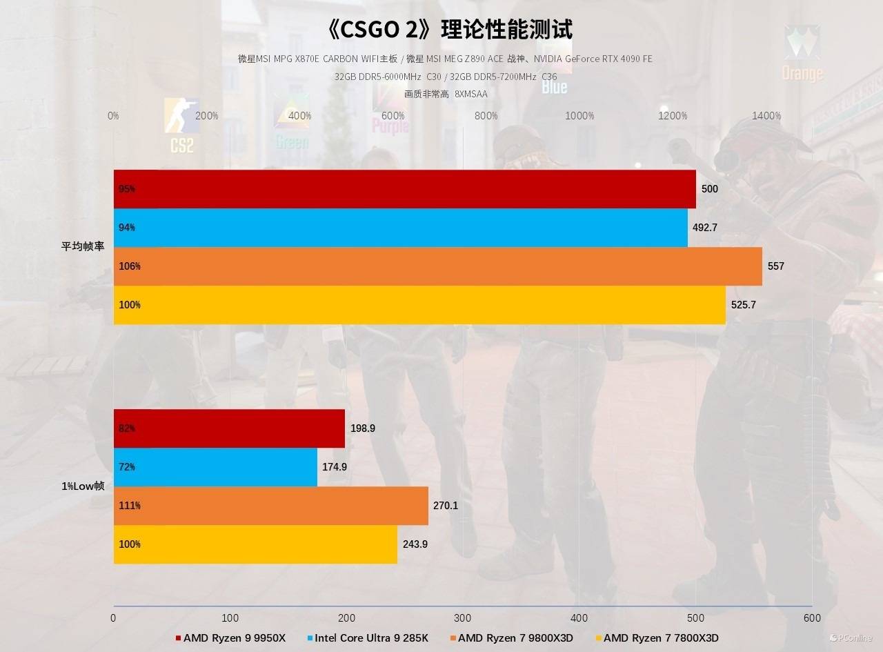 最后是网游《CSGO 2》的表现,这里X3D处理器依旧延续了刚刚的优势,平均帧小幅领先,对比旗舰处理器大概有10%的提升,对比前代锐龙7800X3D的话则是6%。真正强势的是1%Low的表现,270.1 FPS的成绩要比酷睿Ultra 9 285K高了快40%,这比显卡性能提升还离谱。