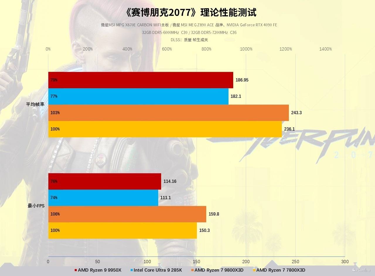 换到《赛博朋克2077》中,无论是平均帧还是1%Low帧,锐龙9800X3D还是一如既往的遥遥领先。平均帧的表现要比锐龙9950X与酷睿Ultra 9 285K高约25%左右,1%Low的表现则有30%的增长,特别是159.8 FPS的1%Low表现,都快接近两款旗舰处理器的平均帧了。
