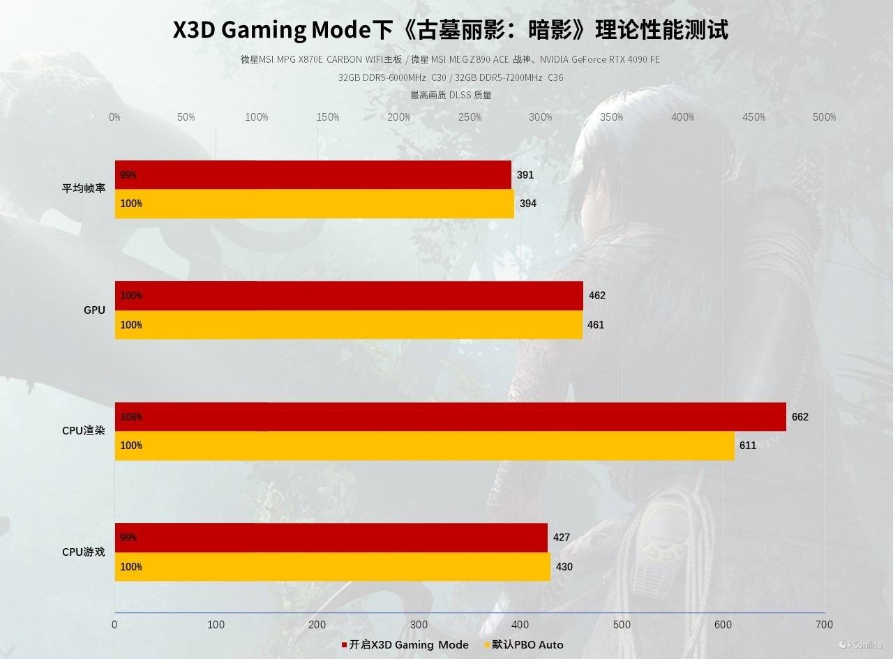 《古墓丽影:暗影》中的表现也差不多,主要提升体现在CPU渲染部分,原本PBO Auto的情况下,CPU渲染为611 FPS,开启X3D Gaming Mode后,提升至662 FPS,涨幅约8%。