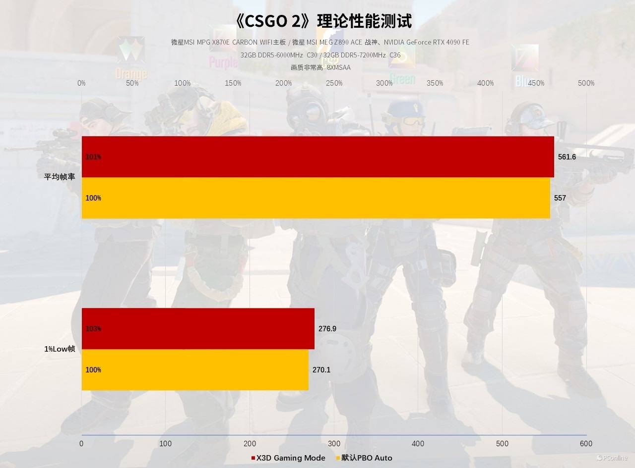 网游部分我们测的是《CSGO 2》,开了X3D Gaming Mode后,平均帧小幅上涨至561.6 FPS,1%Low也提升到了276.9 FPS。