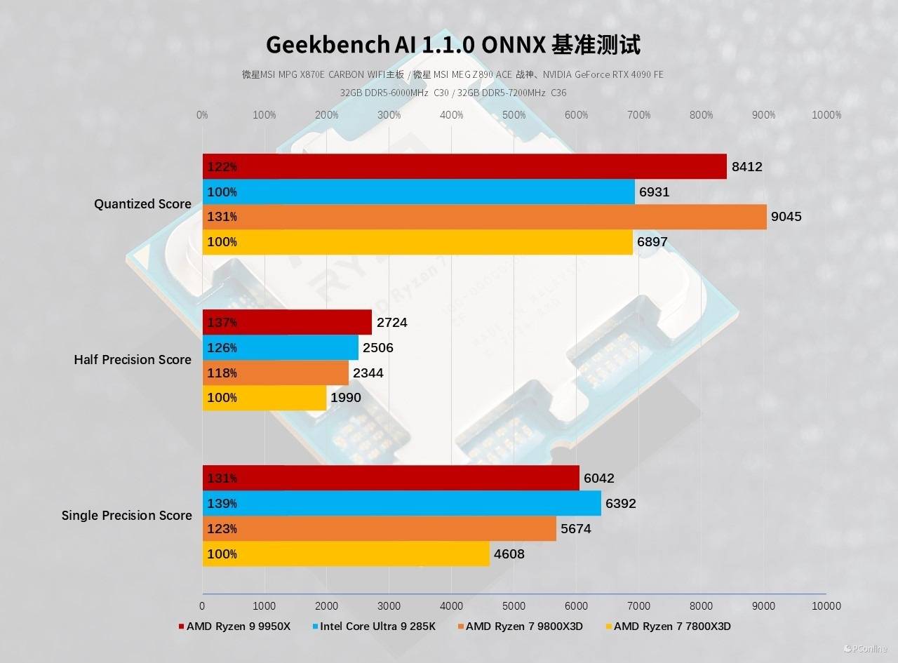 另外GeekBench最近还推出了一个AI性能测试工具,我们也进行了测试,实测锐龙9800X3D在Quantized Score一项上遥遥领先,甚至超越了老大哥锐龙9950X,其他两项测试里,性能也领先前代锐龙7800X3D不少。