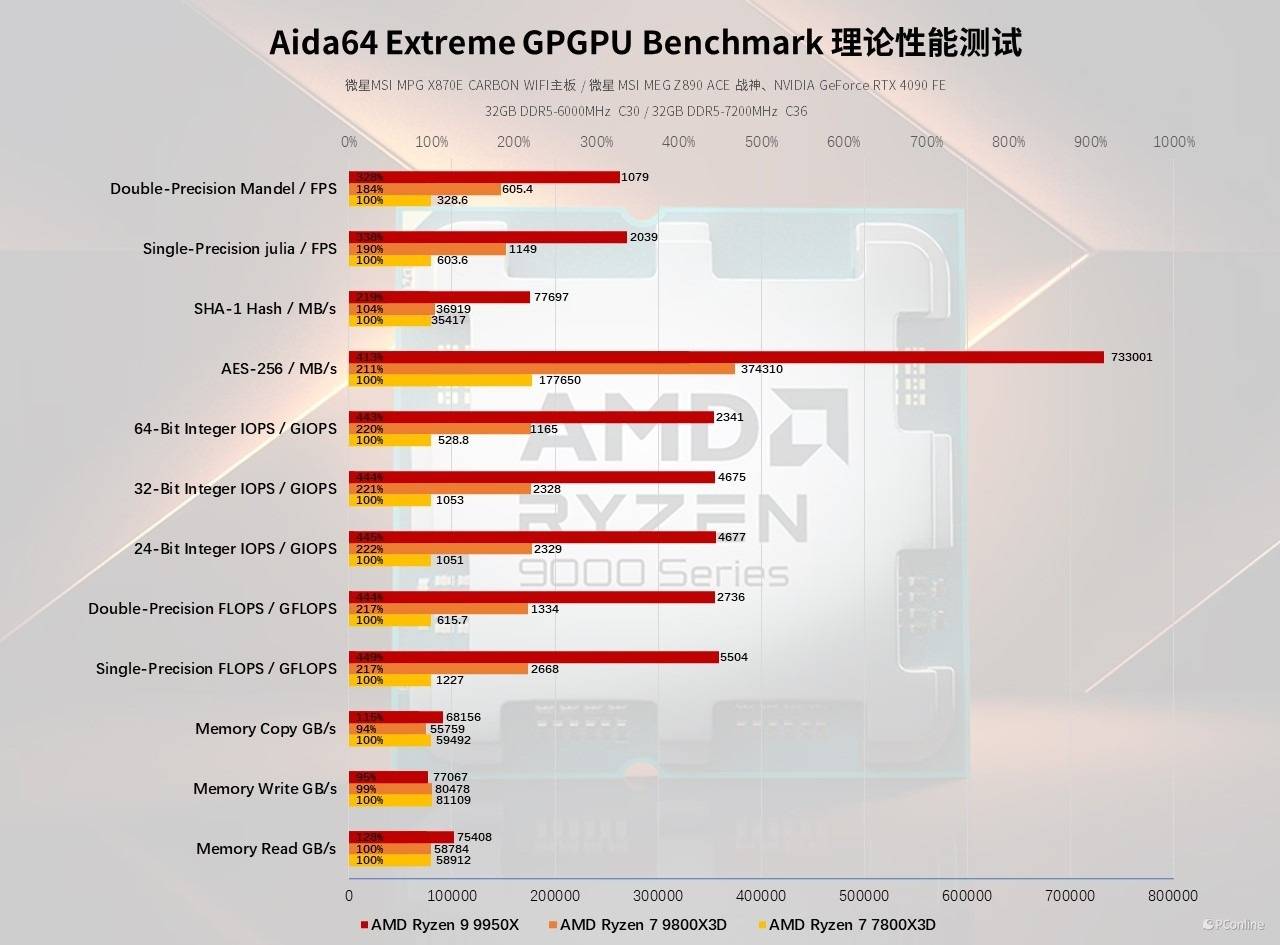 处理器的单核与多核成绩看完了,下面是AIDA64的GPGPU测试。它可以测试GPU与CPU与存储设备之间的数据交互性能表现。从实测数据来看,锐龙9800X3D的性能领先颇多,特别是在单精度、双精度方面,其中“Single-Precision Julia”(SPJ)是对于大型游戏运行的重要衡量参数,而“Double-Precision Mandel”(DPM)则对流体力学,Matlab这类科学运算速度是重要衡量指标。
