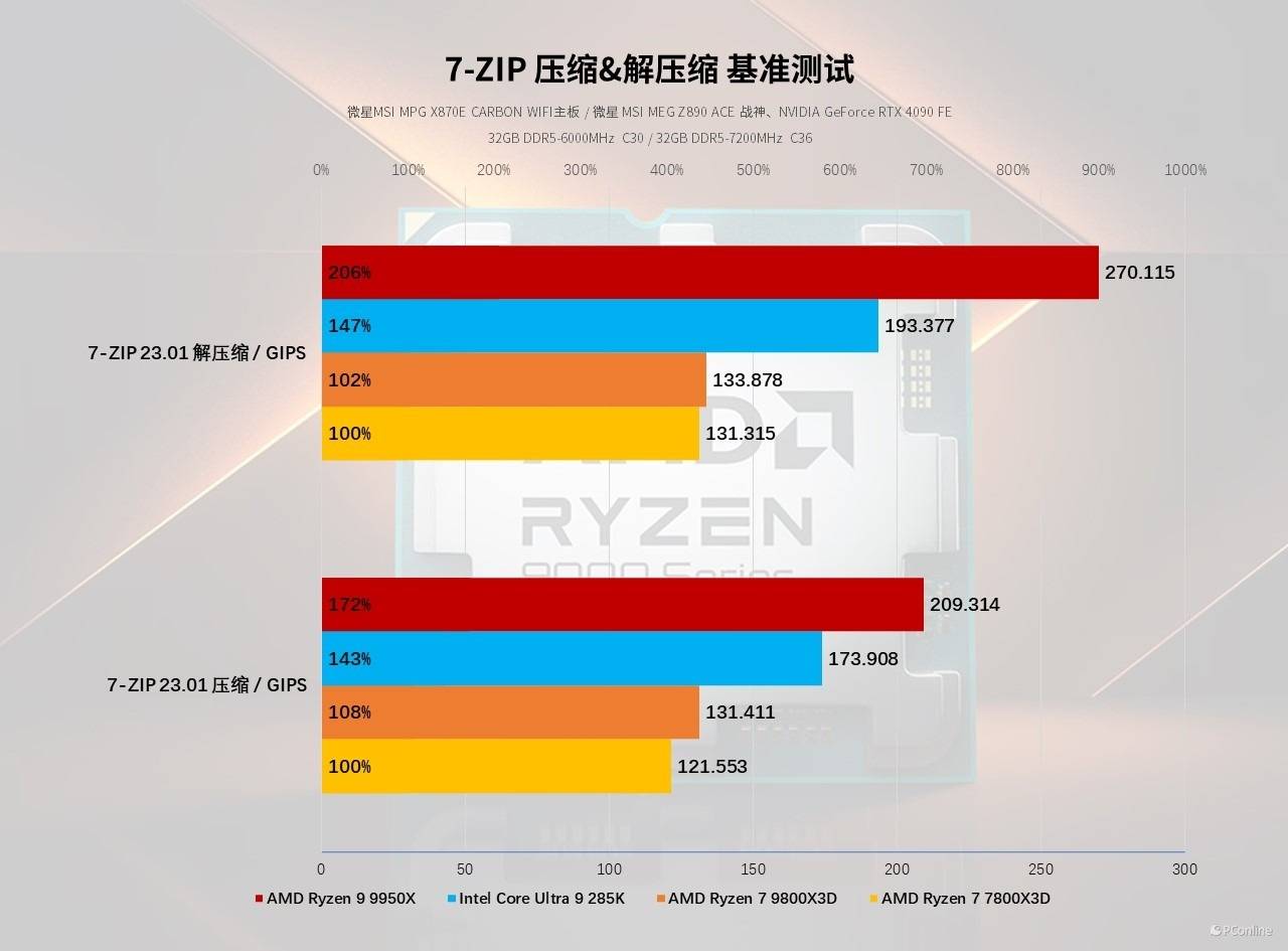 理论性能的最后一项是传统的7-Zip压缩与解压缩测试。这项测试一般与处理器的核心数、线程数相关。实测,虽然锐龙9800X3D还是保持与上代一样的8核,但Zen 5架构的更新与更高的频率也带来了一定的性能提升,压缩方面比前代强8%,解压则是提升了2%左右。