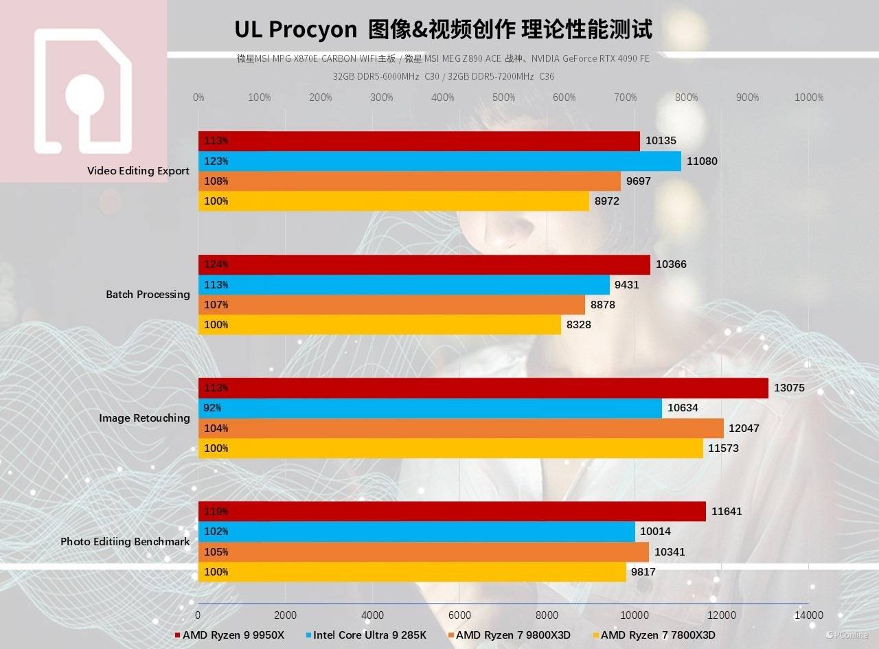 实测结果如上,基本上锐龙9800X3D只在比较依赖单核的Photoshop、LightRoom有优势,前者能够领先锐龙7800X3D约15%,后者则是3%左右,这个结果也印证了上面理论性能测试部分,与锐龙9800X3D的单核提升幅度近似。