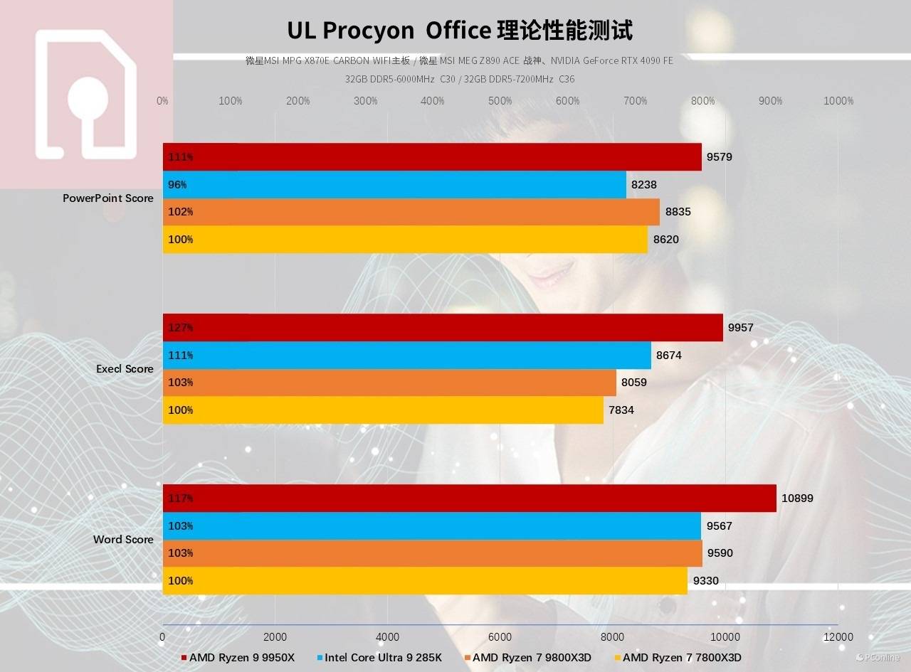 先来点简单的,用UL Procyon的Office进行基础办公能力测试。实测锐龙9800X3D甚至能够打赢隔壁旗舰级的酷睿Ultra 9 285K,表现相当夸张。