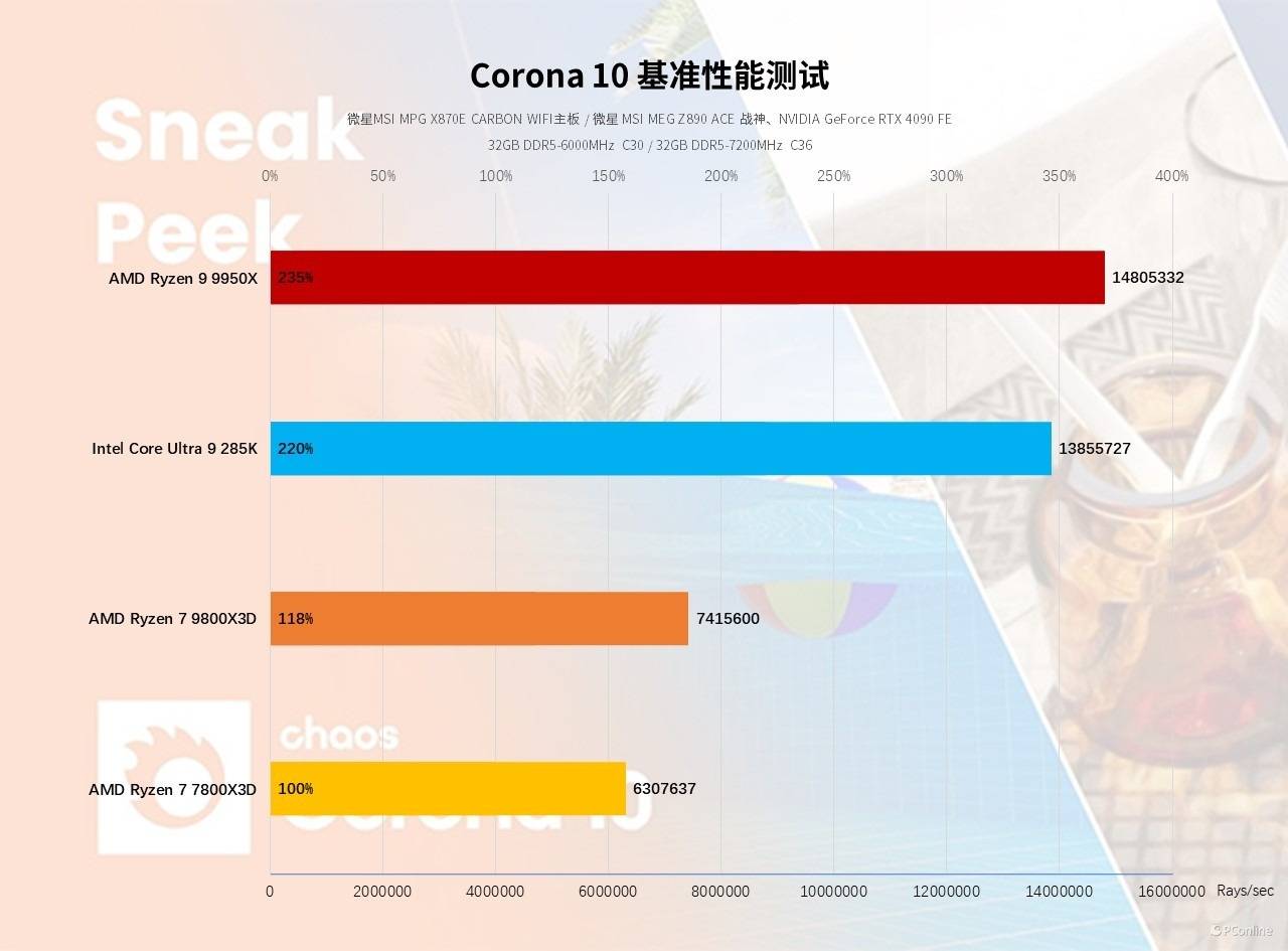 另一个渲染软件Corona的表现也差不多,锐龙9800X3D的成绩为7415600 Rays/Sec,你让它与16核的锐龙9950X相比,肯定是打不过了。不过锐龙9800X3D还是有进步的,对比前代的6307637 Rays/Sec,领先约18%,整体表现还是可圈可点的。