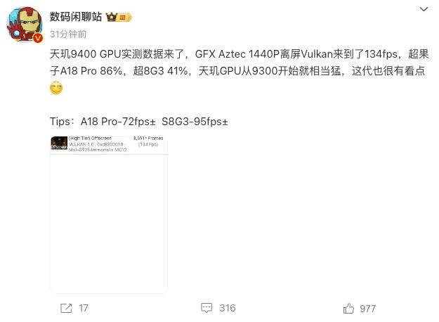 天玑9400性能爆表,GPU引领安卓阵营超越苹果A....推荐人:丁丁小编 发布时间:2024-09-23 17:05:01