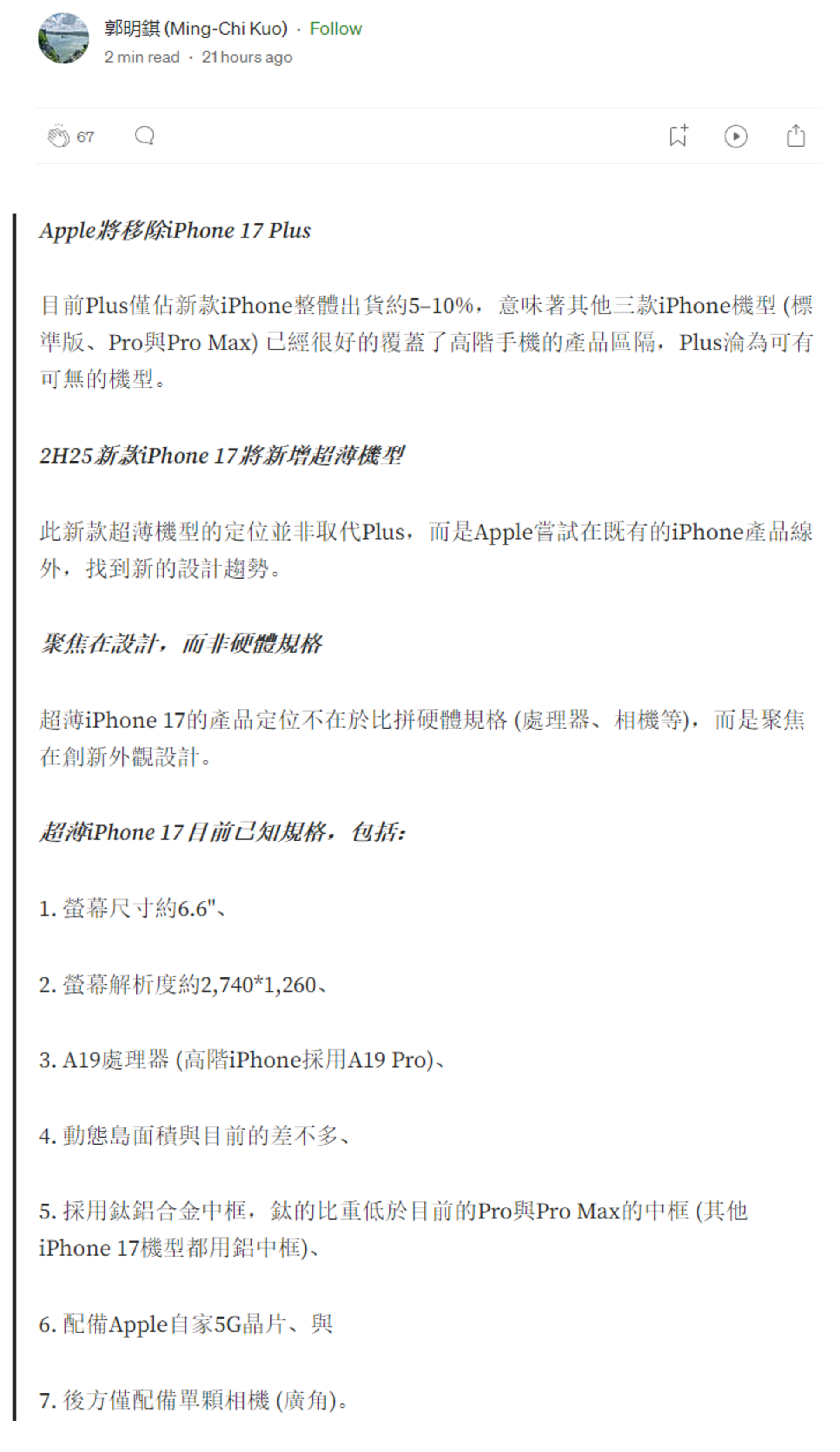 单摄+自研基带,iPhone 17 Slim郭明錤....推荐人:丁丁小编 发布时间:2024-07-26 08:10:01