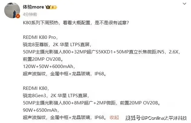 对于大多数人来说,手机影像配置属于既要还要,而影像“升级力度很大”的红米K80,摄像头配置如何呢?博主“体验more”此前曾发文附上其“大概配置”。