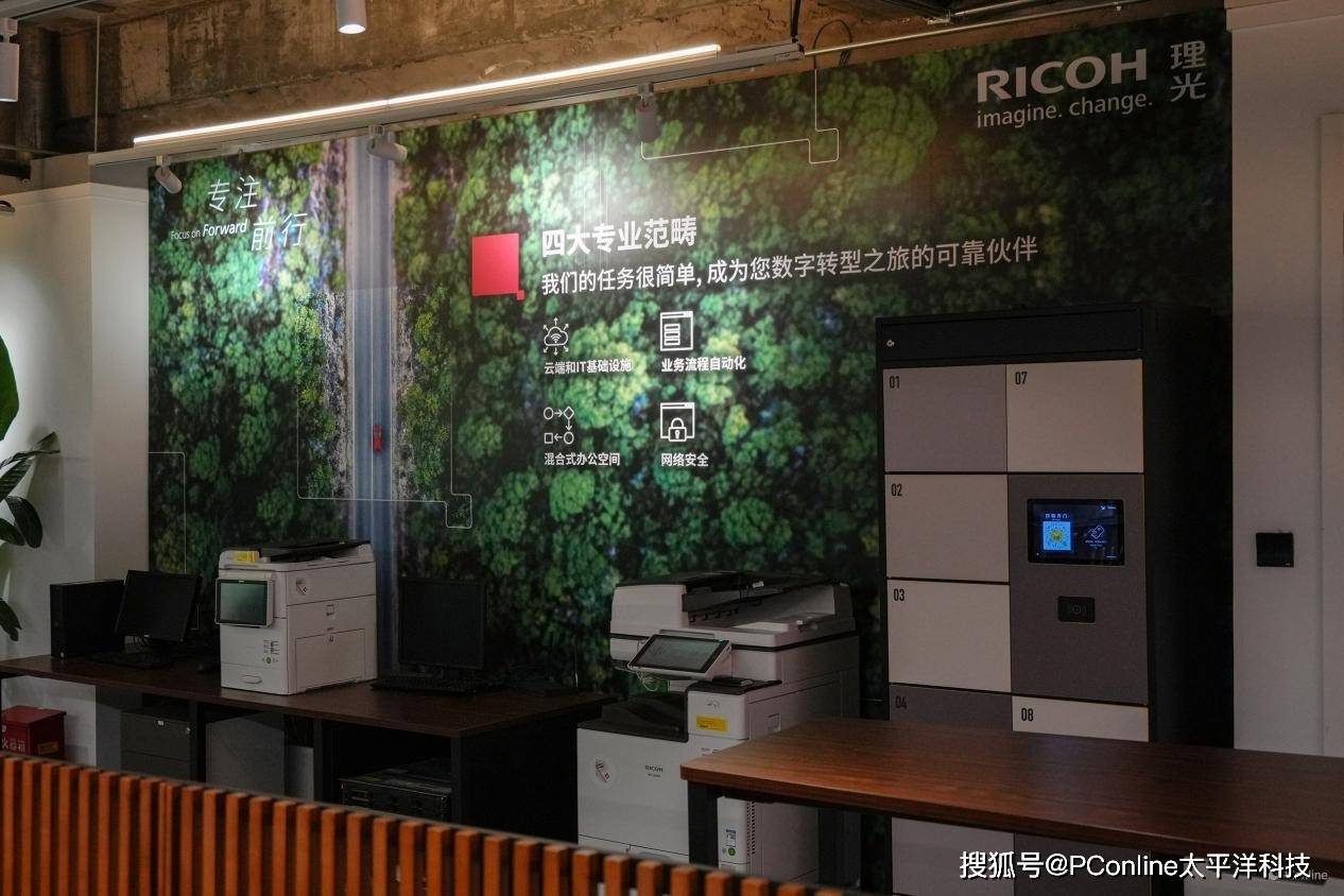 ↑理光中国四大业务范畴:混合式办公空间,业务流程自动化,云端与IT基础设施,网络安全