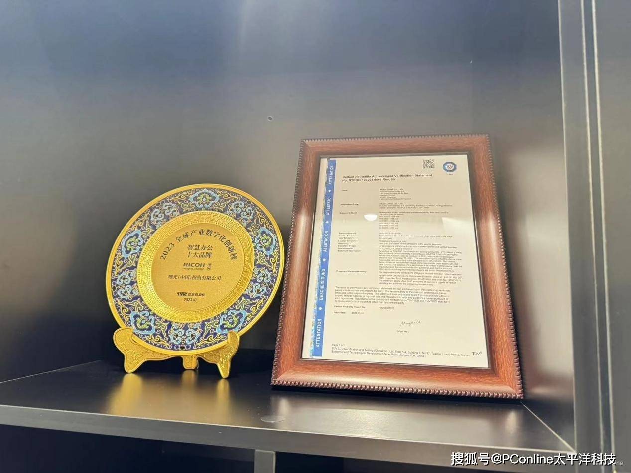 ↑ 右侧文件为理光M C6010系列A3彩色数码复合机取得的行业内首个碳中和认证由国际权威第三方检测、认证机构TÜV南德意志集团颁发