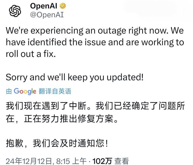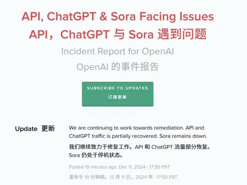 — OpenAI就ChatGPT宕机致歉 部分功能已恢复Sora仍瘫痪 —