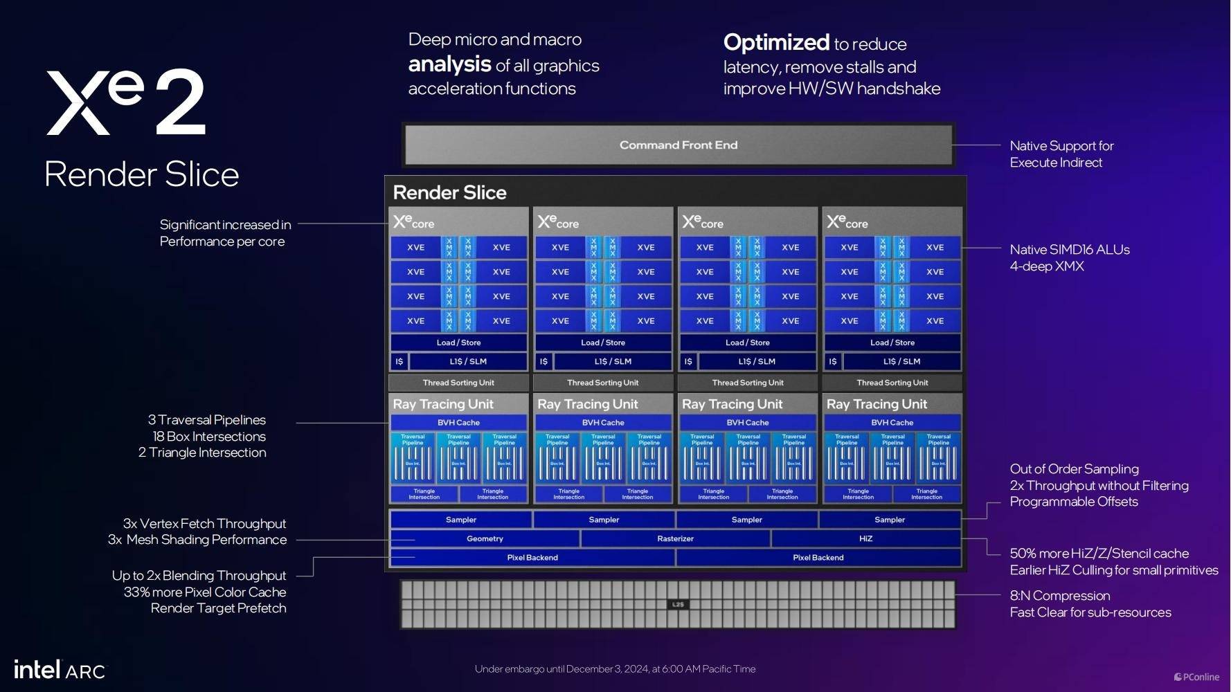 每个渲染切片拥有4个全新设计的Xe2核心以及4个全新设计光追单元。