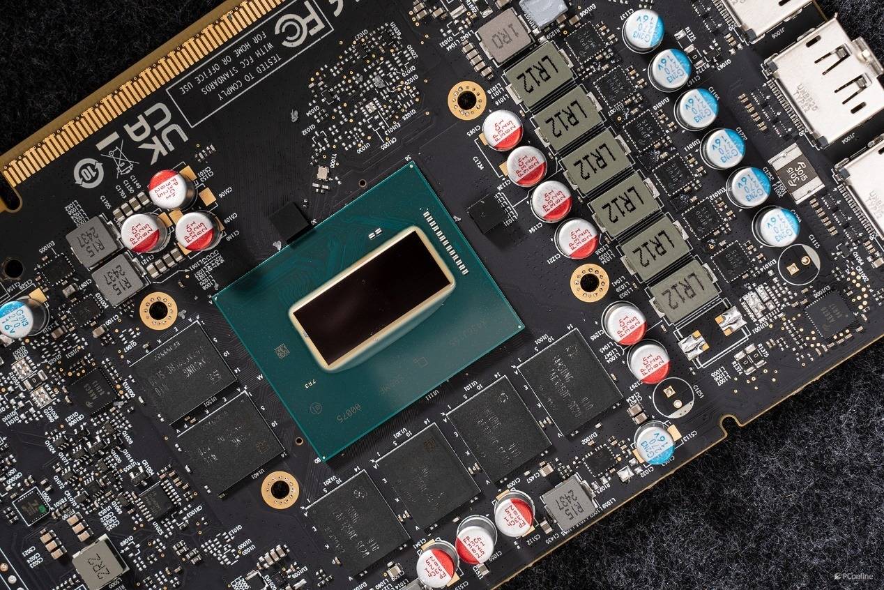 这里咱们就略过无聊的拆解过程,直接给大伙看看显卡的内部结构吧。首先第一眼很难不聚焦在这个犹如镜面的IC上,这就是上面提到的BMG-G21,这个芯片上是没有任何丝印,所以真的如镜面般透亮。