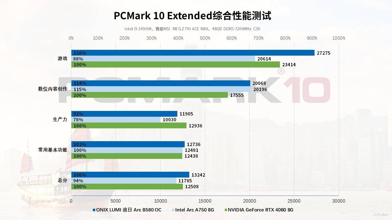 结果显示除了Adobe Premiere Pro测试项里面,ONIX追日B580 OC相比RTX4060的领先幅度超过了10%外,三款显卡的表现相当接近。蓝绿两大厂商在创作软件领域深耕多年,这个结果显示竞争的双方暂时还分不出胜负。