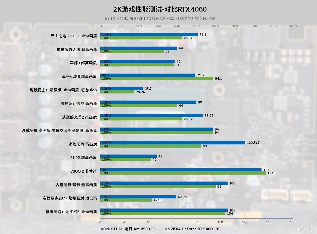 有点出乎我们意料的是,在2K分辨率下,ONIX追日B580 OC 12GB并没有扩大领先幅度,撇开《巫师3》这个特例,它对比A750的帧率领先幅度在15%~40%,表现大致对应1080P分辨率。不过这已经相当了不起,再次重申,ONIX追日B580 OC对比A750属于越级挑战。