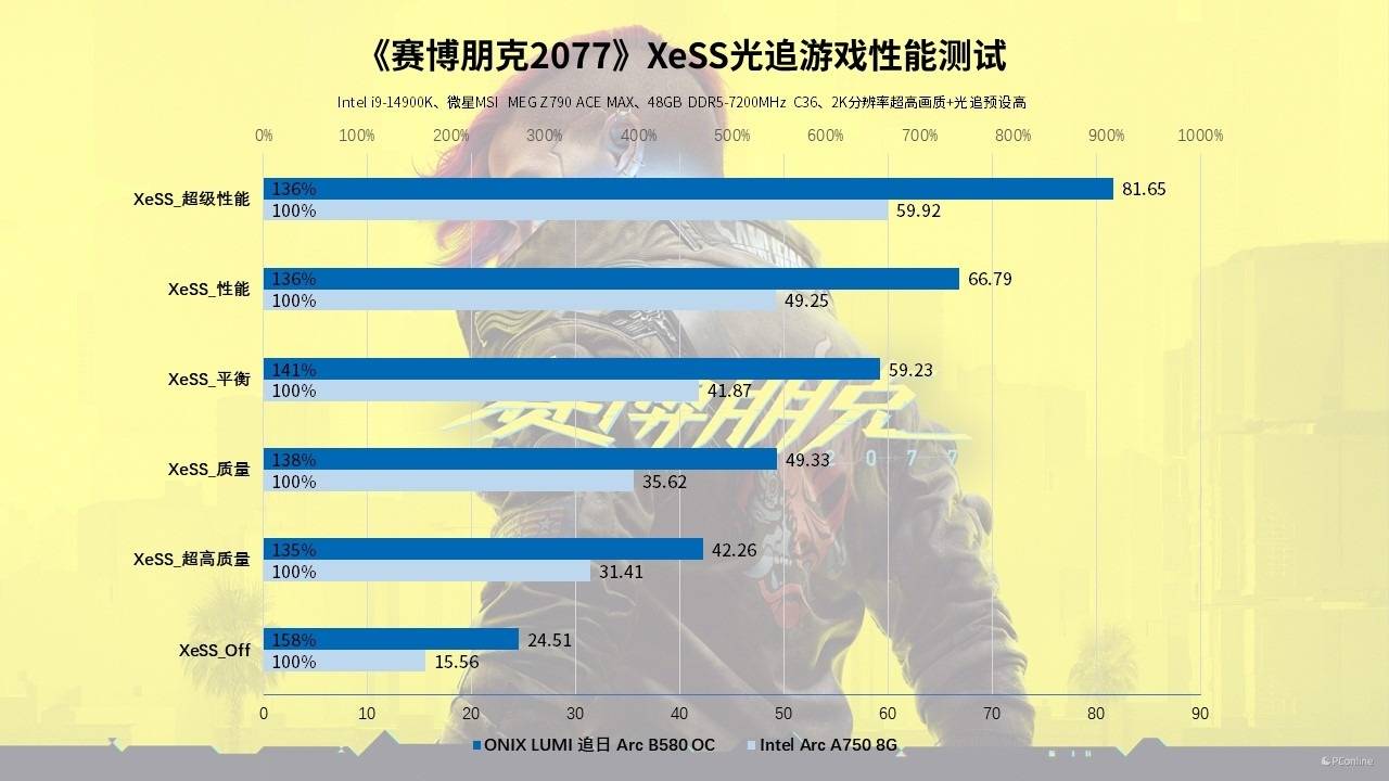 最后看看《赛博朋克2077》的效果,作为新生代的“光追跑分压力测试基准”,这个游戏不但支持时下前沿的帧率增益技术,而且优化还都不错,跑分结果也印证了这一点。在2k分辨率+光追预设高的画质设定下,两张I卡的原生画质的表现都是30FPS以内,一旦开启XeSS,游戏的流畅度就会得到明显改善,ONIX追日B580 OC 12GB在XeSS_平衡档也有不错的流畅度,而A750则需要调到XeSS_超级性能档,但至少也能流畅运行。