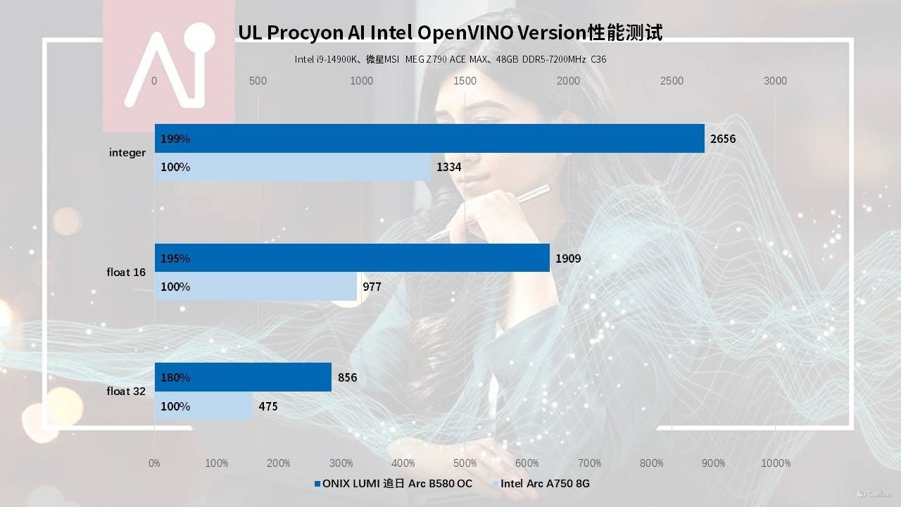 为了探究ONIX追日B580 OC与A750的AI性能为何会出现天壤之别,我们运行了UL Procyon的AI Intel OpenVINO Version一探究竟。实测显示,ONIX追日B580 OC在整数、16位浮点和32位浮点,三个指标均大幅领先A750,其中整数和16位浮点性能几乎是A750的2倍。加之ONIX追日B580 OC本就有12GB大显存优势,难怪AI实际应用的表现会比A750优秀得多。