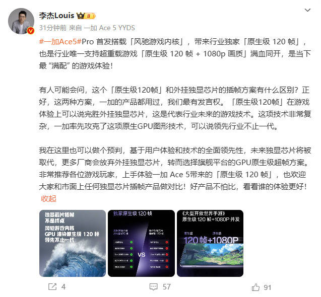 — 一加李杰预测更多厂家会使用GPU原生级超帧方案,放弃外挂独显插帧方案 —