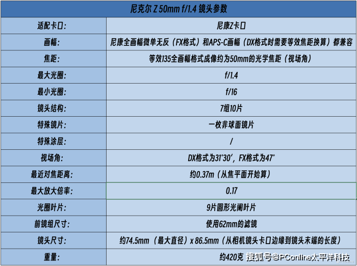 当然,进入正式的使用体验和相关测试前,还是请大家和我们一起来看看尼克尔 Z 50mm f/1.4的相关镜头参数!