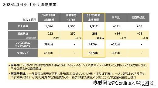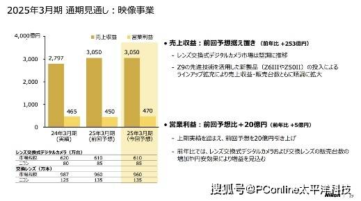 在“影像业务”方面,可以发现尼康正逐步以全画幅无反相机“Z8”、“Zf”及新产品“Z6Ⅲ”等中高端影像机身产品为中心,扩大面向专业、爱好者人群的中高级机身和镜头的销售预期。实际市场表现销量正在稳步增长,且表现强劲。由于产品结构改善导致平均售价上升,销售额和利润均有所增长。实际表现为影像业务销售收入为1517.91亿日元,同比去年同期增长约10.2%。营业收入为288.48亿日元,同比去年增长14.4%。整体来看尼康“影像相关业务”,尼康做出2025财年后续影像业务业绩预测,“就全年经营环境来看,影像业务中的数码相机市场销售状况预计保持强劲,且中高端相机市场将持续增长”。
