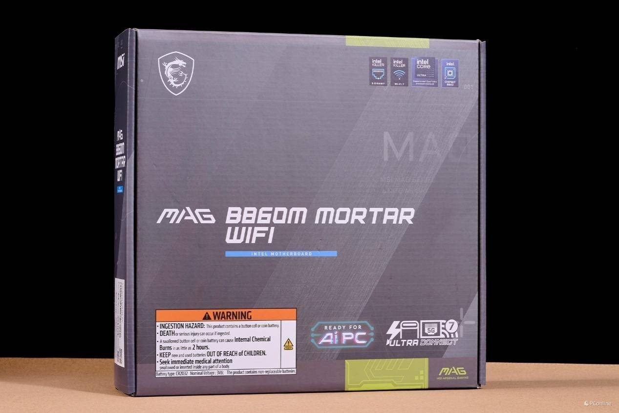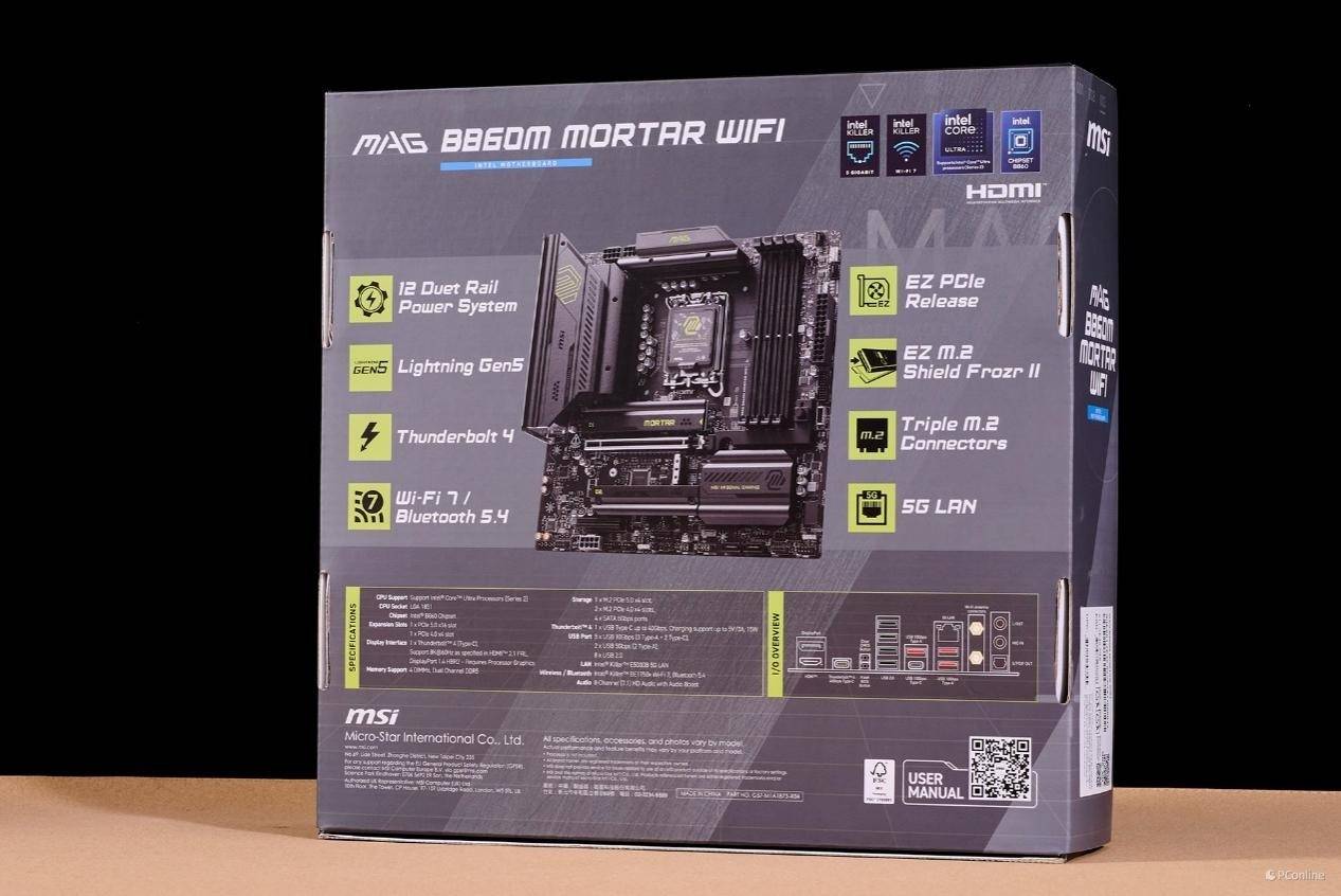 微星MSI MAG B860M MORTAR WIFI主板依然继续保持MORTAR主板的设计语言,不过包装上有些许改动,过往包装盒上会有金属铭牌的标识,而现在换成了灰黑色的金属拉丝纹理,整体显得更加高级。