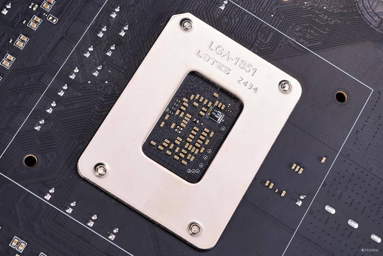 首先我们先看主板的CPU底座,光从外观上似乎看不太出来,其实这代主板已经换上了最新的LGA 1851接口。跟之前LGA 1700接口不同,目前酷睿Ultra 200S系列台式机处理器用的就是LGA 1851,其不兼容以往的主板,只支持在最新英特尔800系列主板上使用。