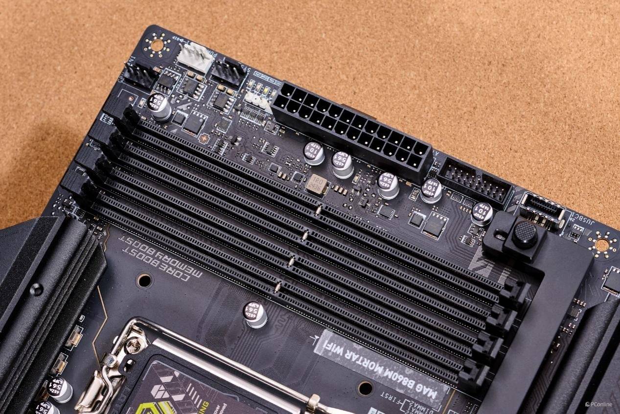 再看隔壁的DDR5内存插槽,酷睿Ultra 200S系列台式机处理器能够充分释放DDR5内存的潜力。微星B860M迫击炮标配四根DDR5内存插槽最高支持安装192GB的内存总容量,性能上更是逆天,在优化BIOS设计以及智能化内存超频设置的加持下,这款主板能够实现9200MHz的超高内存频率。