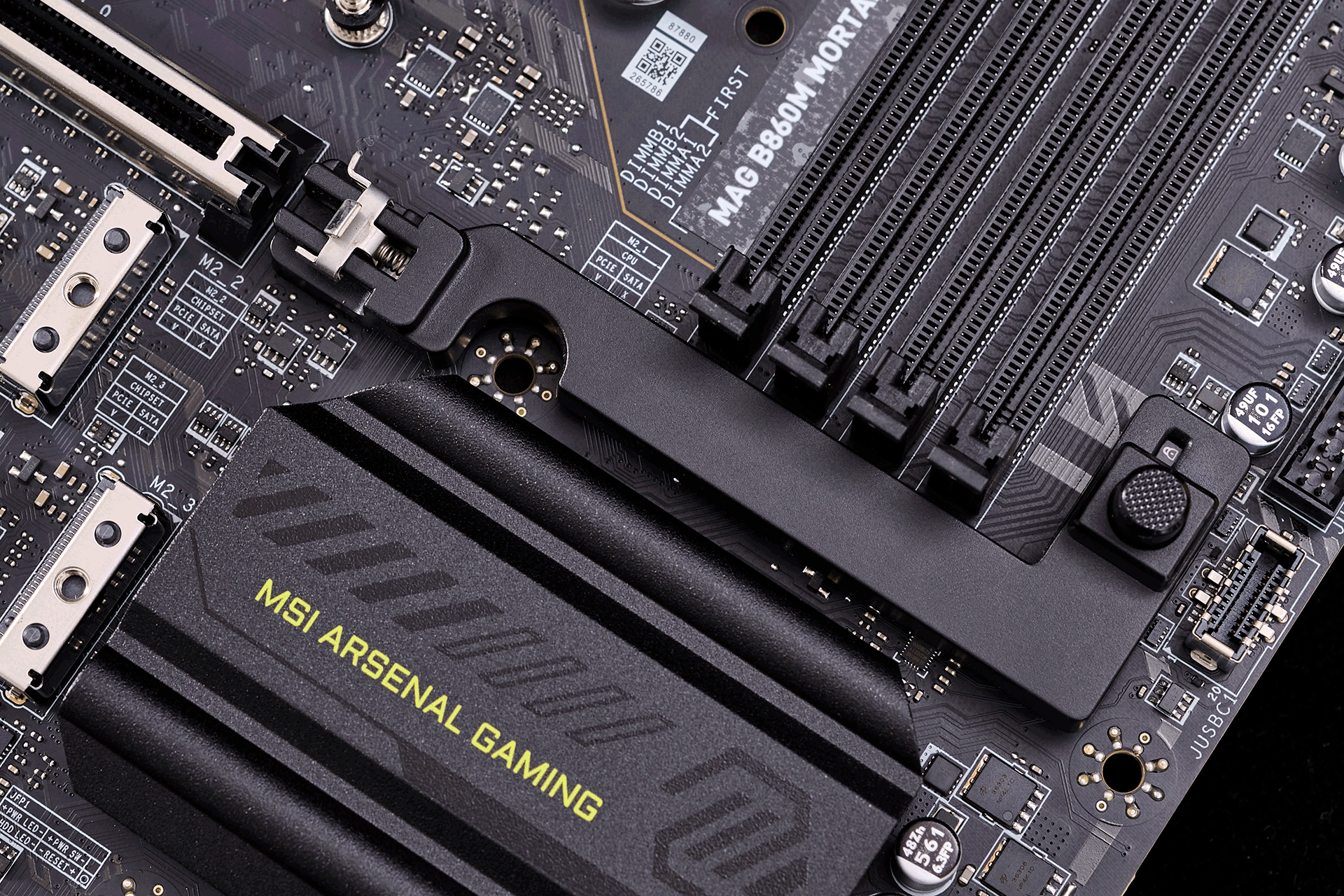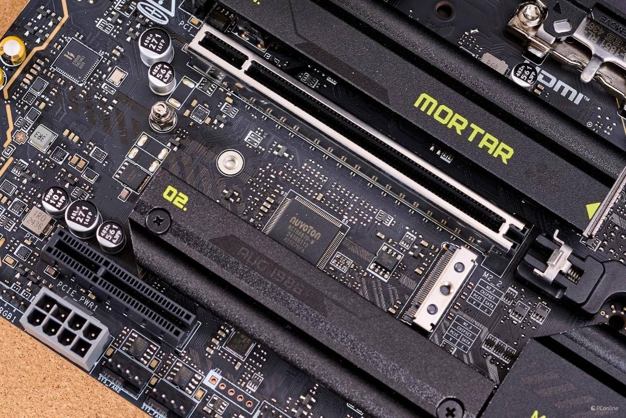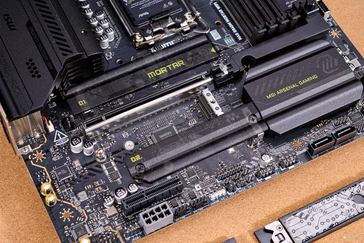 固态硬盘槽位上,微星B860M迫击炮相比上代也有了明显的进步。这一代主板提供了三个M.2固态硬盘插槽,其中离CPU最近的一个是PCIe 5.0槽位,剩下的两个则均支持PCIe 4.0速率。