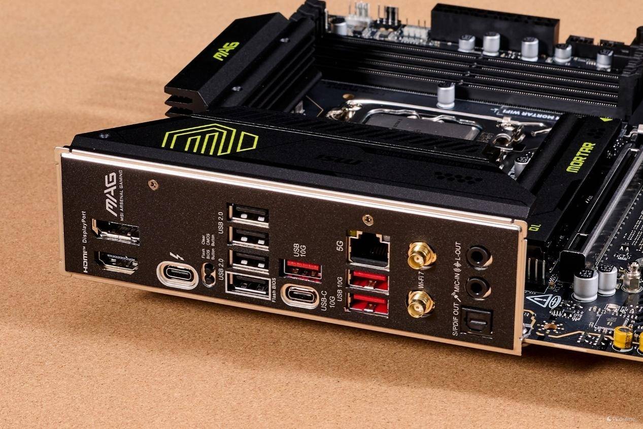 后置面板接口也是相当的丰富,从左至右分别是:HDMI接口、DP接口、雷电4接口、4个USB 2.0接口、3 个 USB 10Gbps Type-A接口、1个USB 10Gbps Type-C接口、5Gbps LAN (RJ45)接口、Wi-Fi 天线接口以及音频插孔与光纤 S/PDIF 输出接口。