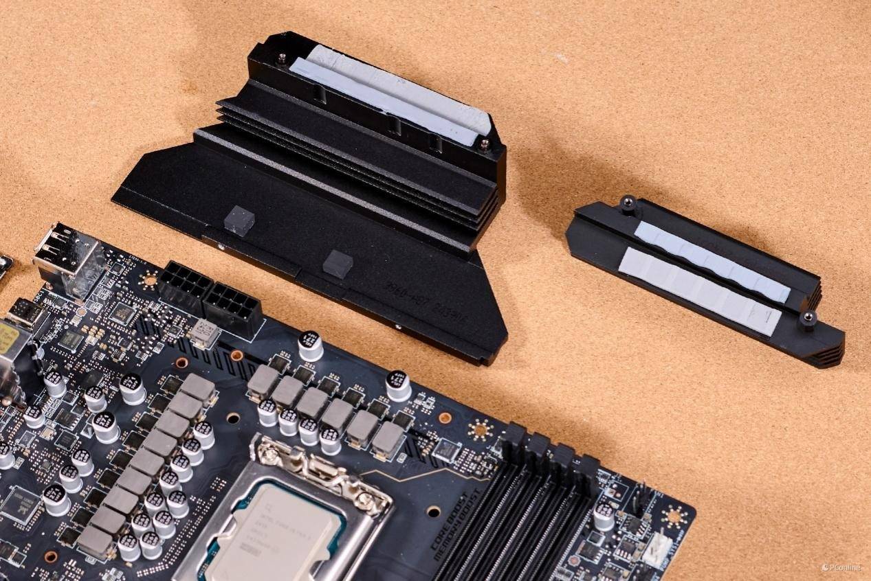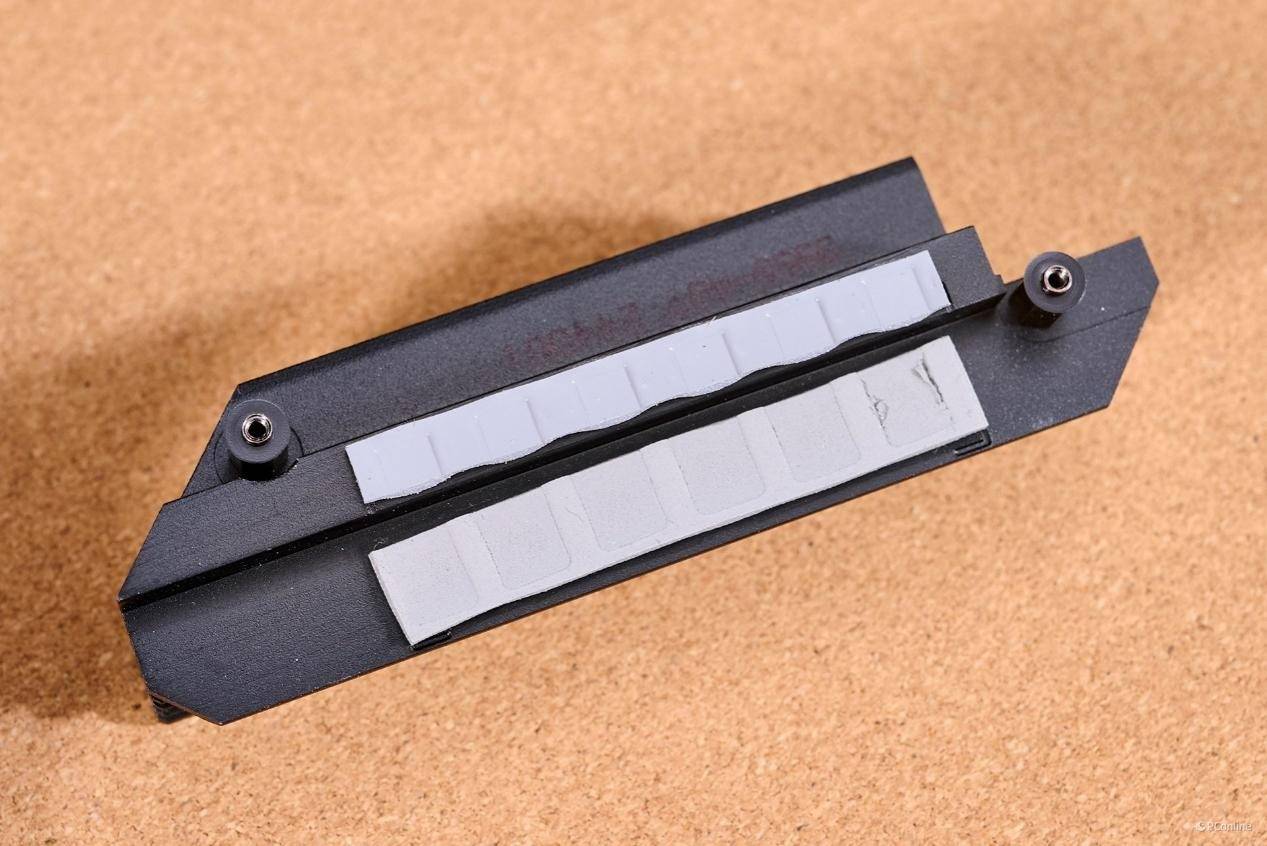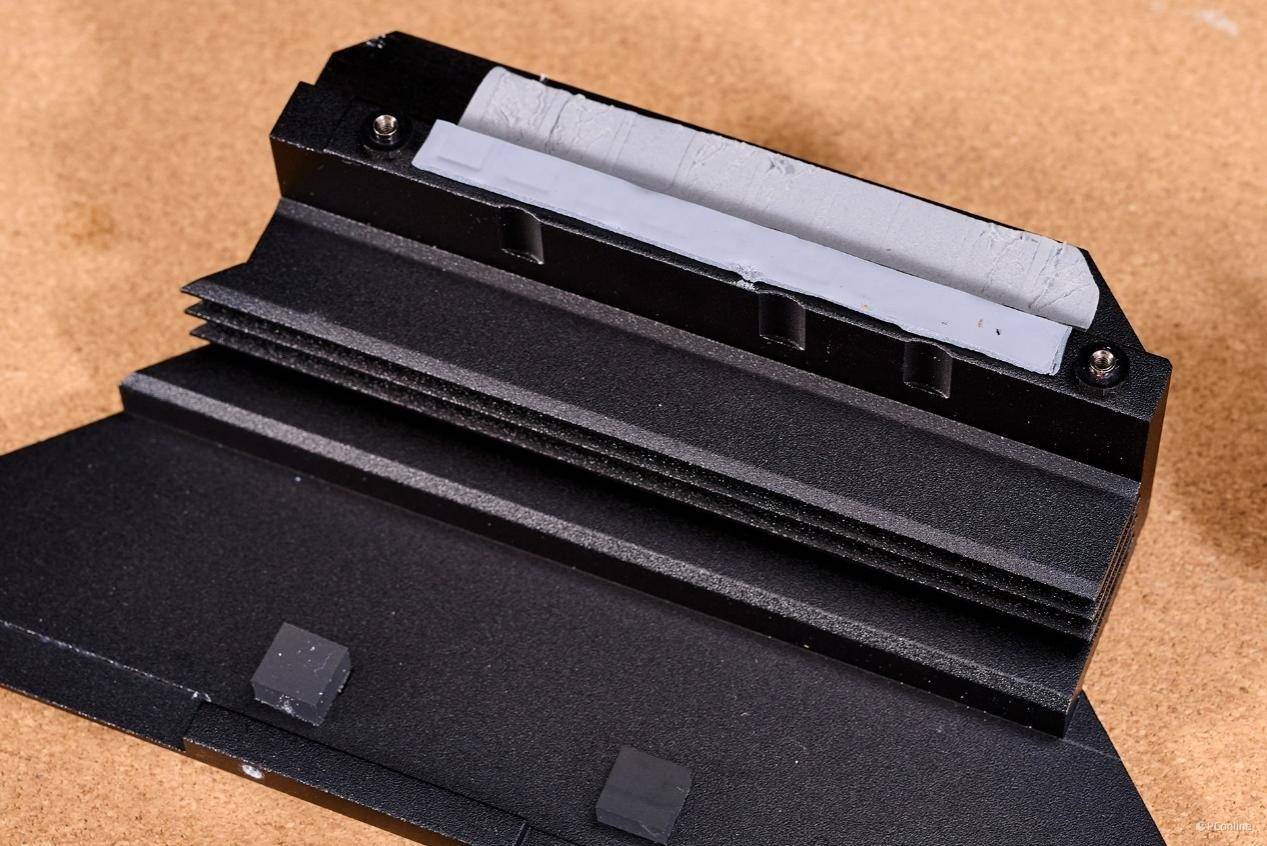 并且每个硬盘位都配备了又厚又重的第2代免工具M.2冰霜铠甲,就算是烤机再狠,也不用担心过热。每块散热片的底下还是厚厚的导热垫,拿在手上份量十足。