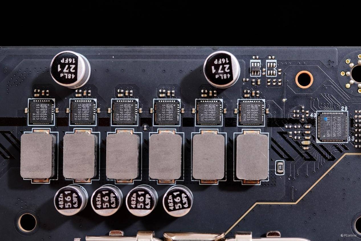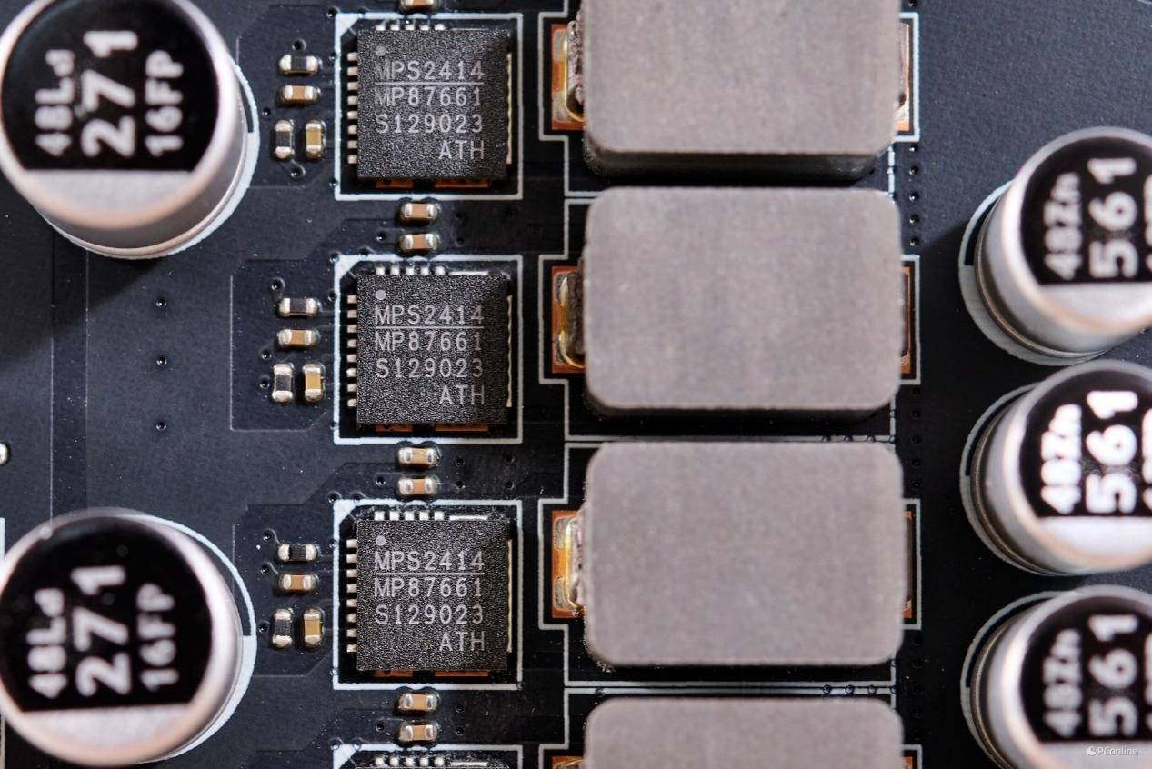 每相核心供电都配备了单独的DrMos芯片,根据芯片上的丝印可知其来自MPS,印刷编码为:MP87661,最大支持电流为60A。
