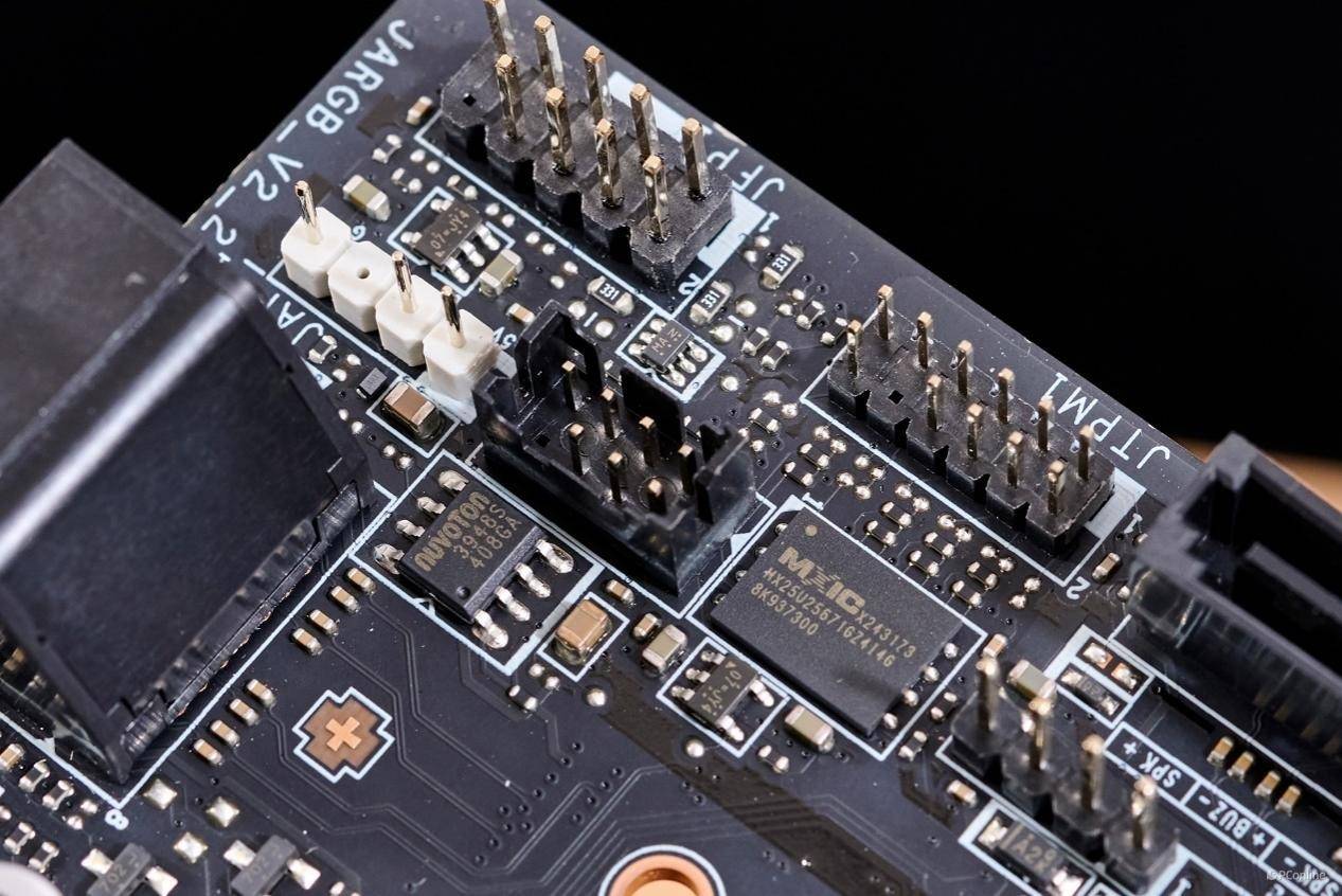 主板的底部还有常见的USB 2.0接针,能够扩展出4个USB 2.0 Type-A接口,满足外设产品的需要。