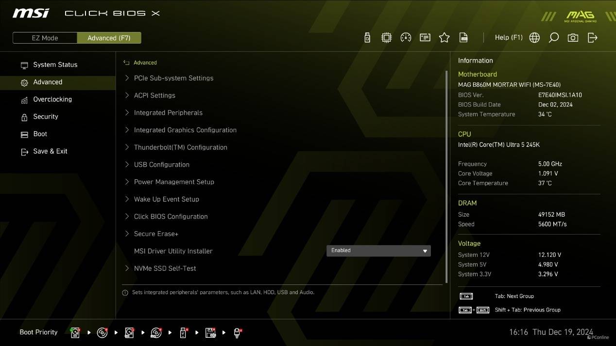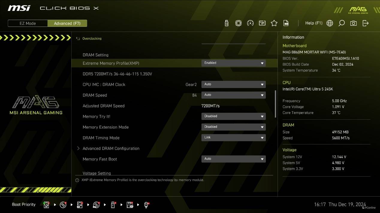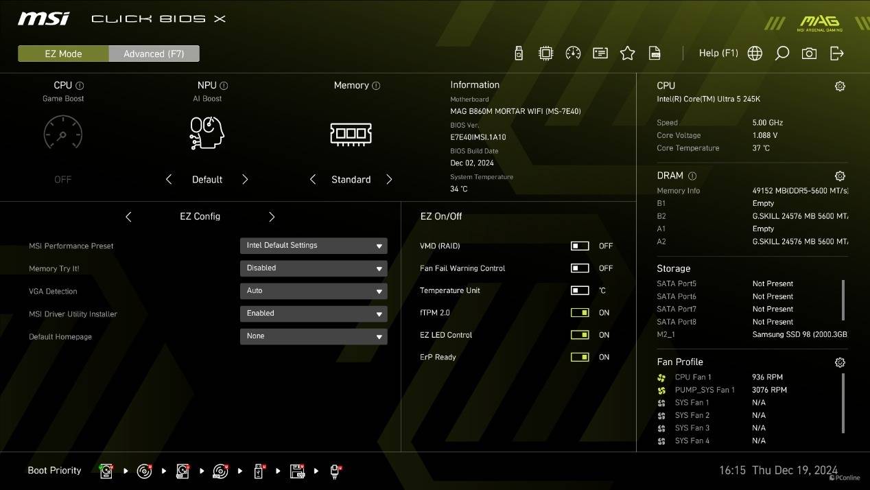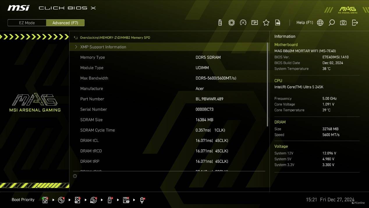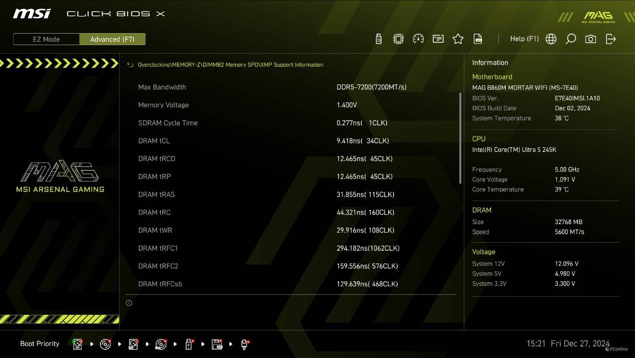虽然外观变化,不过操作逻辑还是一样的。简易模式下,XMP、开关核显、NPU、等功能都直接放在了显眼的位置,玩家能够轻松控制。而按F7则可以进入高级模式,这里能对平台进行更多自定义设定。
