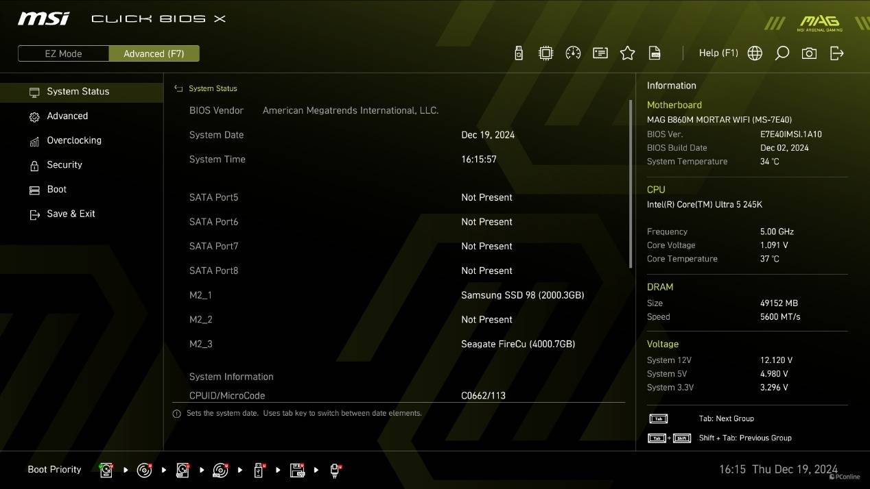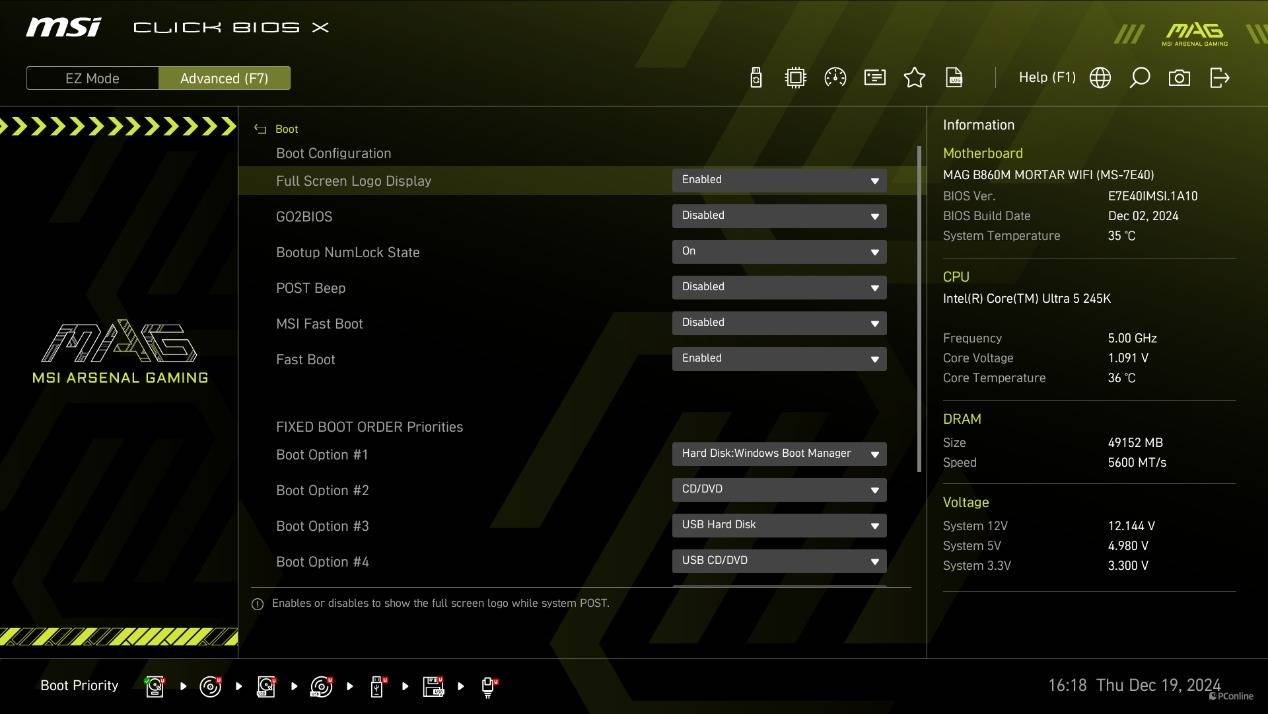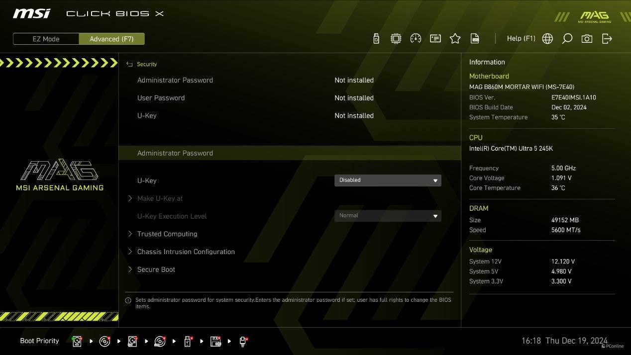 下面我们来看一下微星B860M迫击炮主板的BIOS。没错,这次微星的主板BIOS也进行了升级换代。全新的BIOS界面用上了更新潮的UI界面,并且据微星的说法,不同系列会有专属的BIOS设计,例如我们手上的微星MSI MAG B860M MORTAT WIFI主板的BIOS界面里就有独属“MAG”的Logo。
