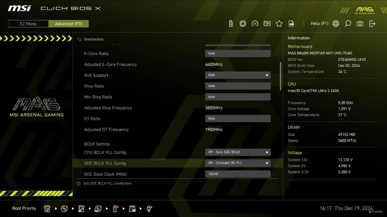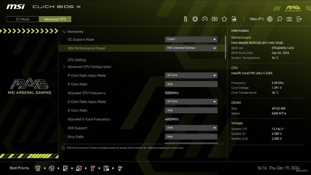 不过大部分玩家最关心的应该还是超频页面的选项。这里你可以精细化的调节酷睿Ultra 200S系列处理器的电压设置,从而让内存实现更高的频率。