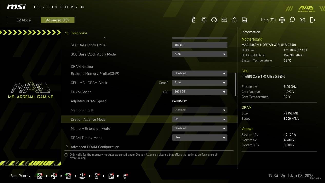 甚至使用上经过微星与内存厂商合作优化过的内存型号,更是可以开启微星微星Dragon Alliance Mode功能,比XMP档更高效且方便。