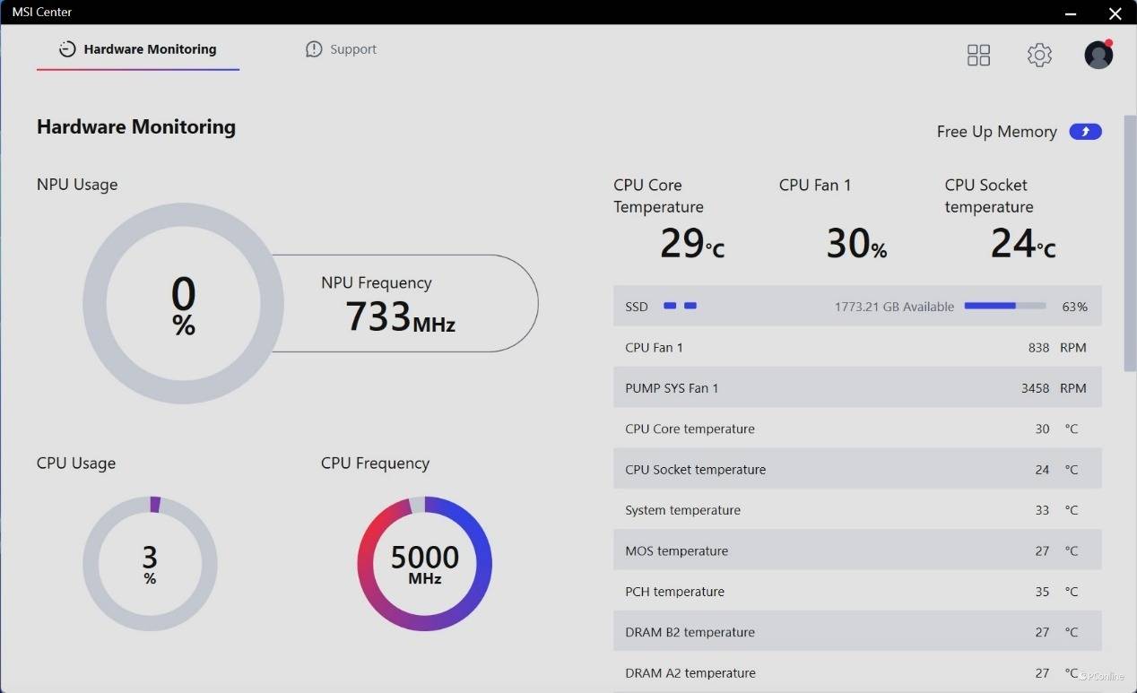除了BIOS进行了更新外,MSI Center也迎来了新版本,刚启动就能看出这一代处理器的重点就是NPU的应用,在首页中NPU使用率被放大了,非常醒目。
