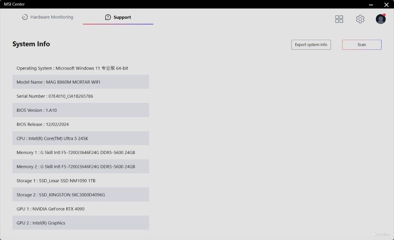 另外,还有支持页面,这里可以看到整个平台的硬件信息,还可以对驱动软件进行更新检查。