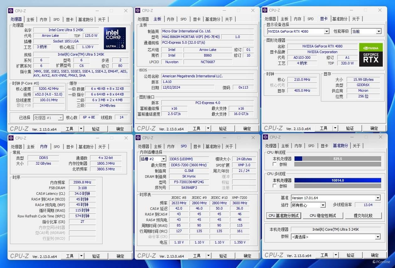 正式测试前我们也用CPU-Z浅浅的跑了一下分,实测酷睿Ultra 5-245K单核成绩829.5分,这个成绩与K其实相差无几了,多核方面则是10814分,与Z890平台上表现基本一致。