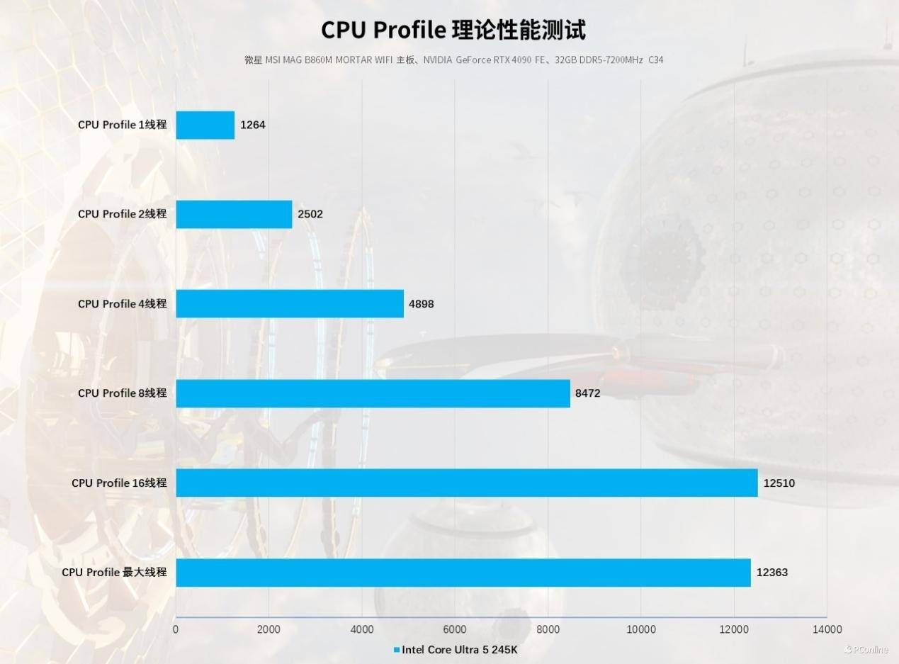 我们也测试了CPU Profile项目,看看实际应用中,这颗酷睿Ultra 5-245K有何亮眼表现。测试中果然不负众望,其相比前代产品,能有10%以上的性能领先。最大线程方面,酷睿Ultra 5-245K能够跑到12363分,虽然砍了超线程,但性能依旧超越了20%以上。