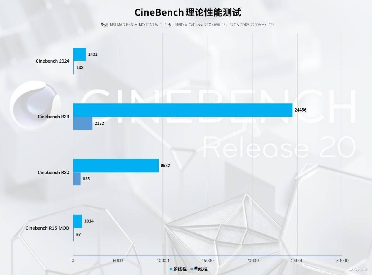 R23的压力就更大了,不过酷睿Ultra 5-245K的表现还是令人惊喜,轻轻松松跑出了单核2172,多核24456的成绩。最后是2024版本,这套平台同样有不俗的表现,单核为132,非常接近隔壁9950X的单核表现了,多核则为1431。